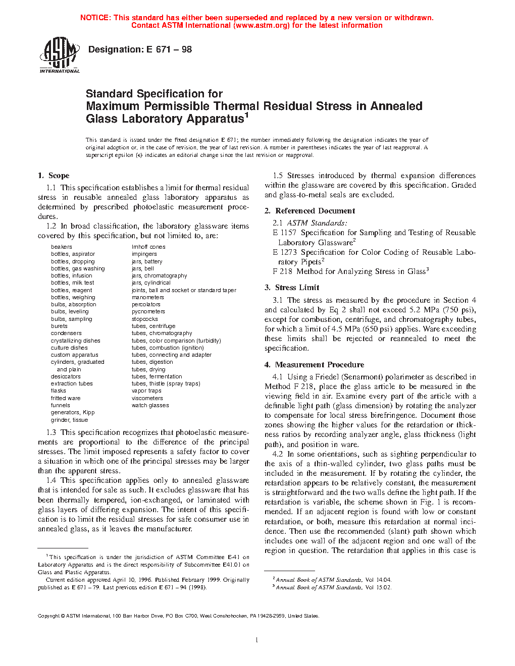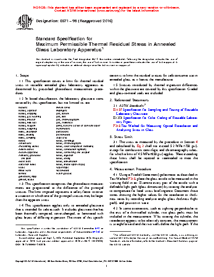 1.1 This specification covers a limit for thermal residual stress in reusable annealed glass laboratory apparatus as determined by prescribed photoelastic measurement procedures.