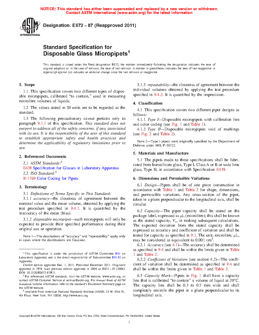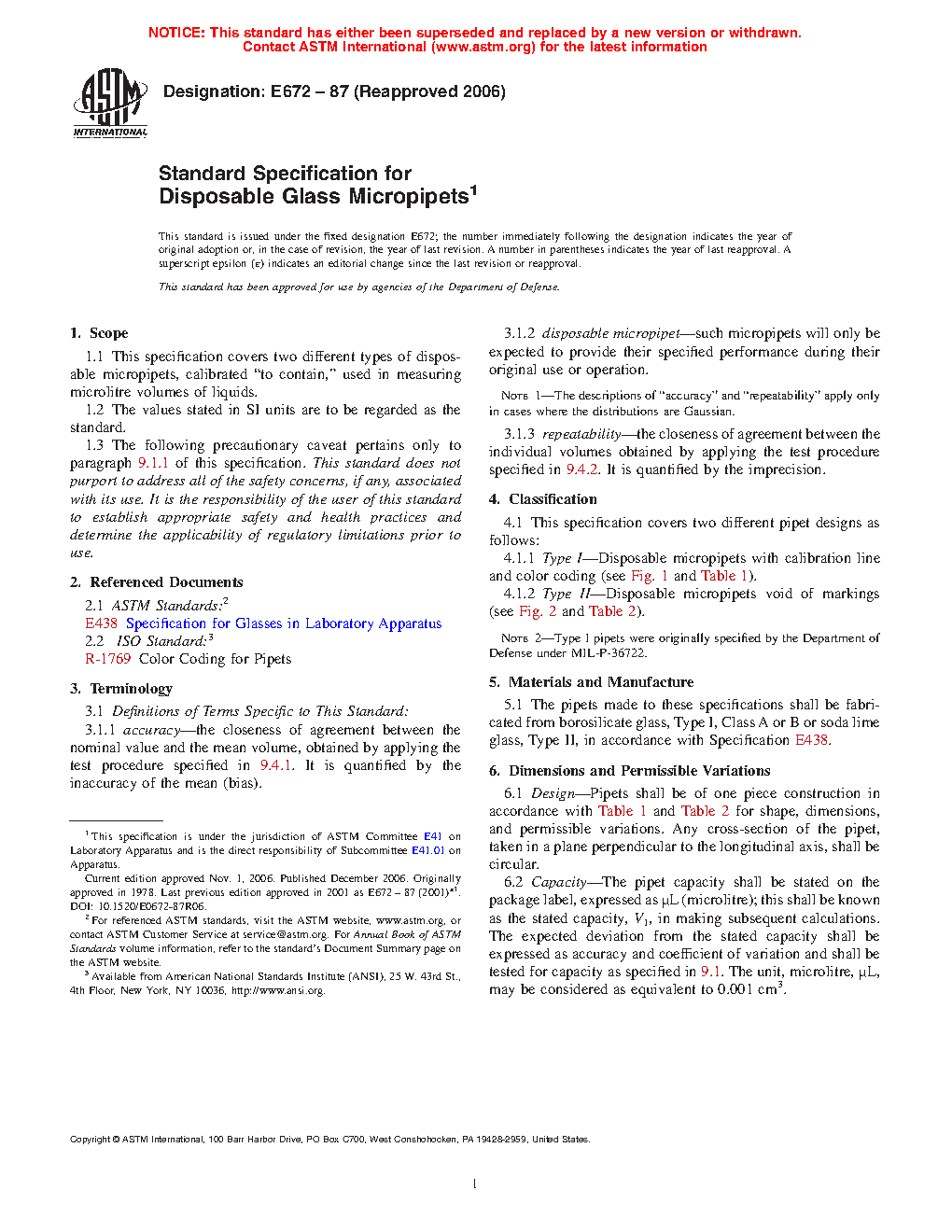 1.1 This specification covers two different types of disposable micropipets, calibrated “to contain,” used in measuring microlitre volumes of liquids.