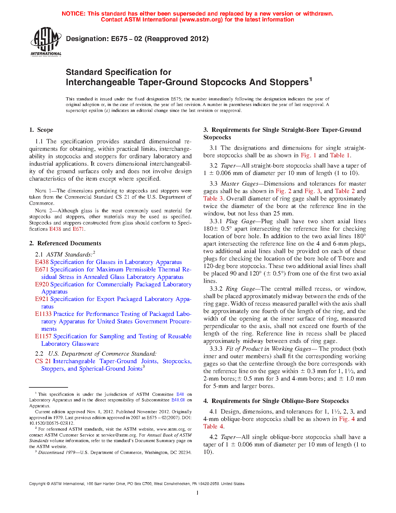 The specification provides the standard dimensional requirements for obtaining, within practical limits, interchangeability in stopcocks and stoppers for ordinary laboratory and industrial applications. It solely covers ground surfaces dimensional interchangeability, and does not involve design characteristics of the item except where specified. Materials shall be tested and shall conform to the specified values of design, dimension, designation, tolerances, taper, and master gages; as stated in the requirements for Single Straight-Bore Taper-Ground Stopcocks, Single Oblique-Bore Stopcocks, Double Oblique-Bore (Three-Way) Stopcocks, T-Bore and 120-deg Bore Stopcocks, Taper-Ground Flask Stoppers, and Taper-Ground Bottle Stoppers.