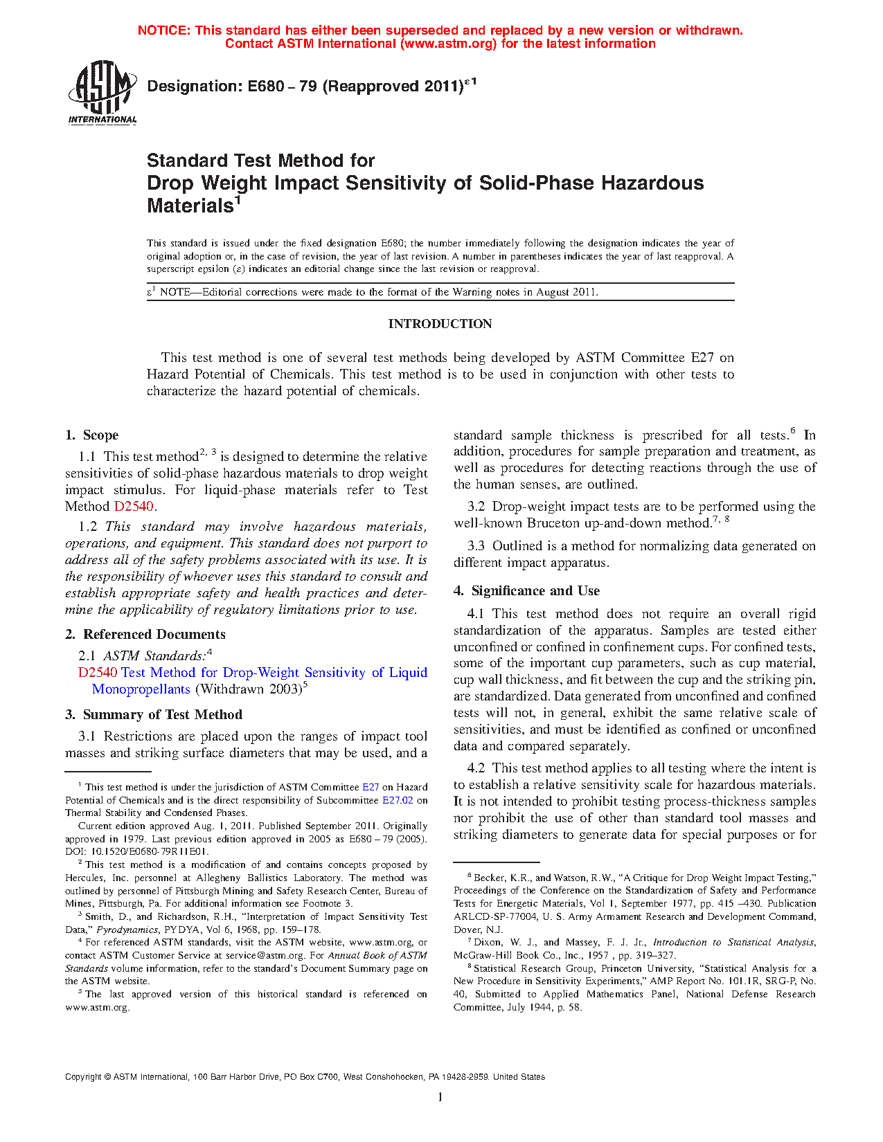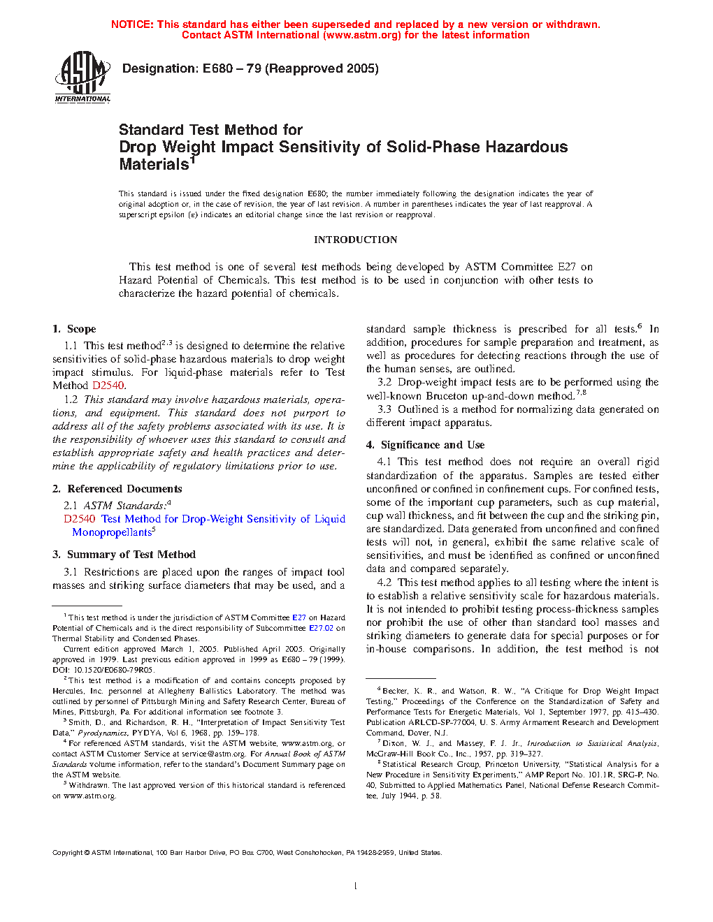 1.1 This test method2, 3 is designed to determine the relative sensitivities of solid-phase hazardous materials to drop weight impact stimulus. For liquid-phase materials refer to Test Method D2540.