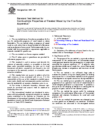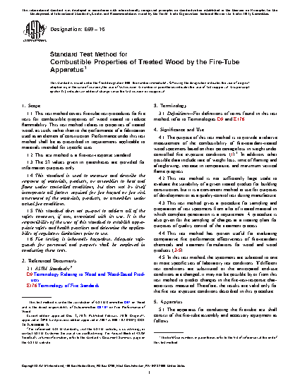 1.1 This test method covers fire-tube test procedures for fire tests for combustible properties of wood treated to reduce flammability. This test method relates to properties of treated wood, as such, rather than to the performance of a fabrication used as an element of construction. Performance under this test method shall be as prescribed in requirements applicable to materials intended for specific uses.