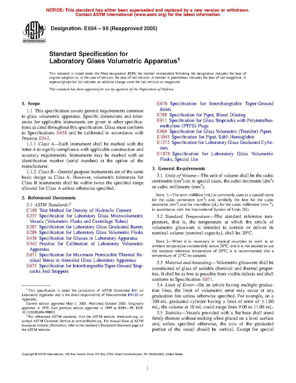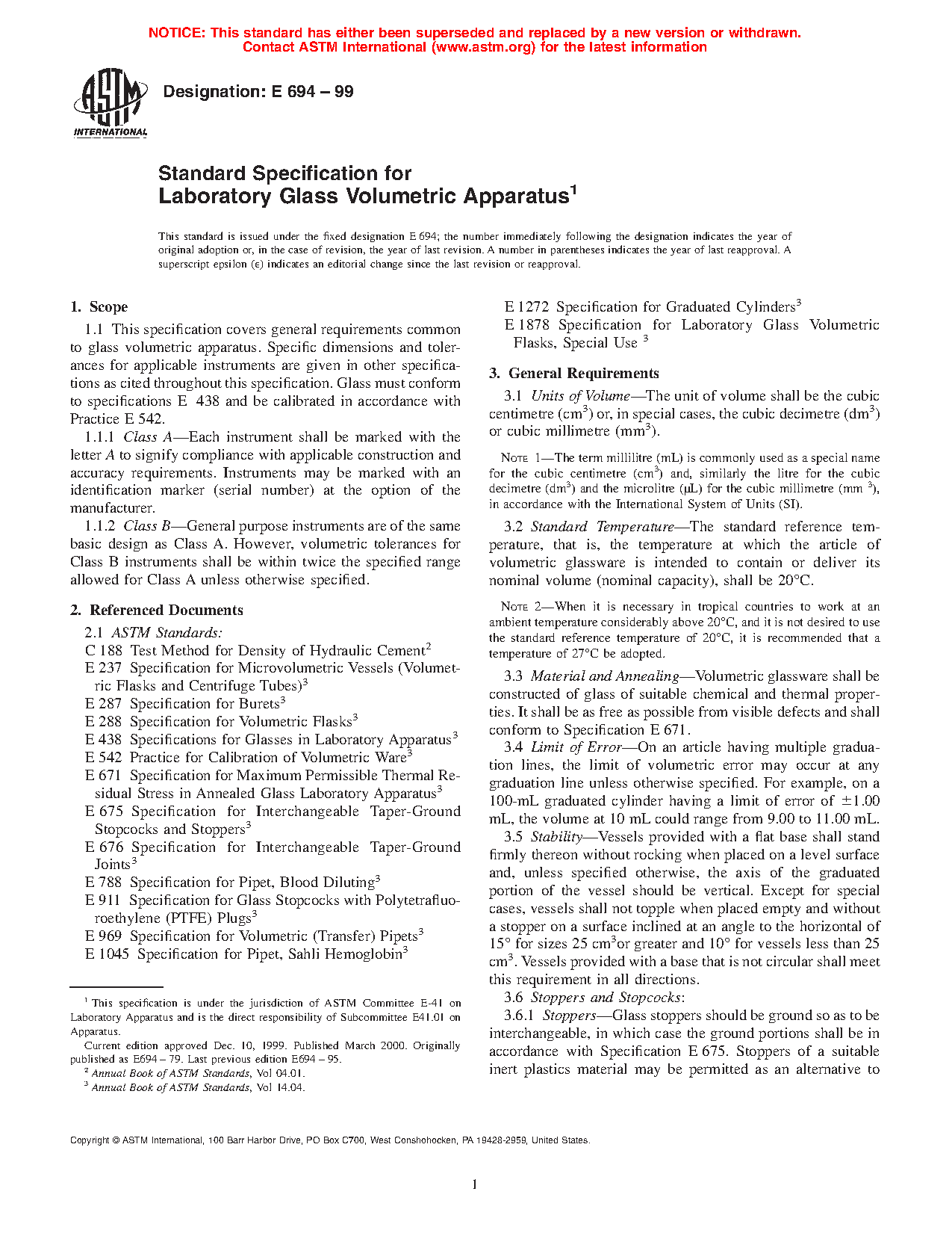 1.1 This specification covers general requirements common to glass volumetric apparatus. Specific dimensions and tolerances for applicable instruments are given in other specifications as cited throughout this specification. Glass must conform to Specifications E438 and be calibrated in accordance with Practice E542.