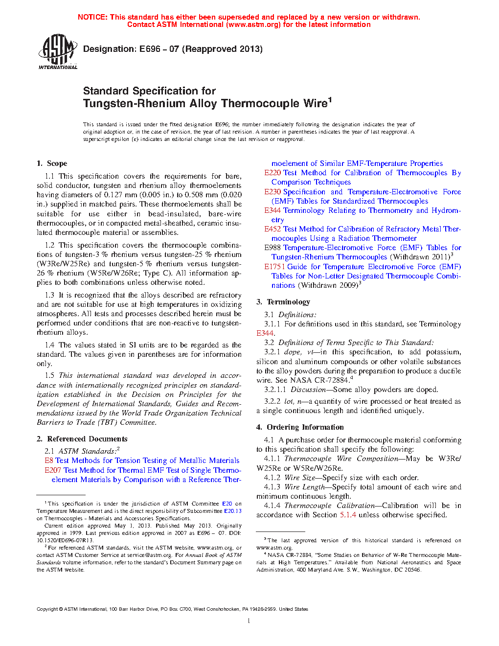 1.3 It is recognized that the alloys described are refractory and are not suitable for use at high temperatures in oxidizing atmospheres. All tests and processes described herein must be performed under conditions that are non-reactive to tungsten-rhenium alloys.