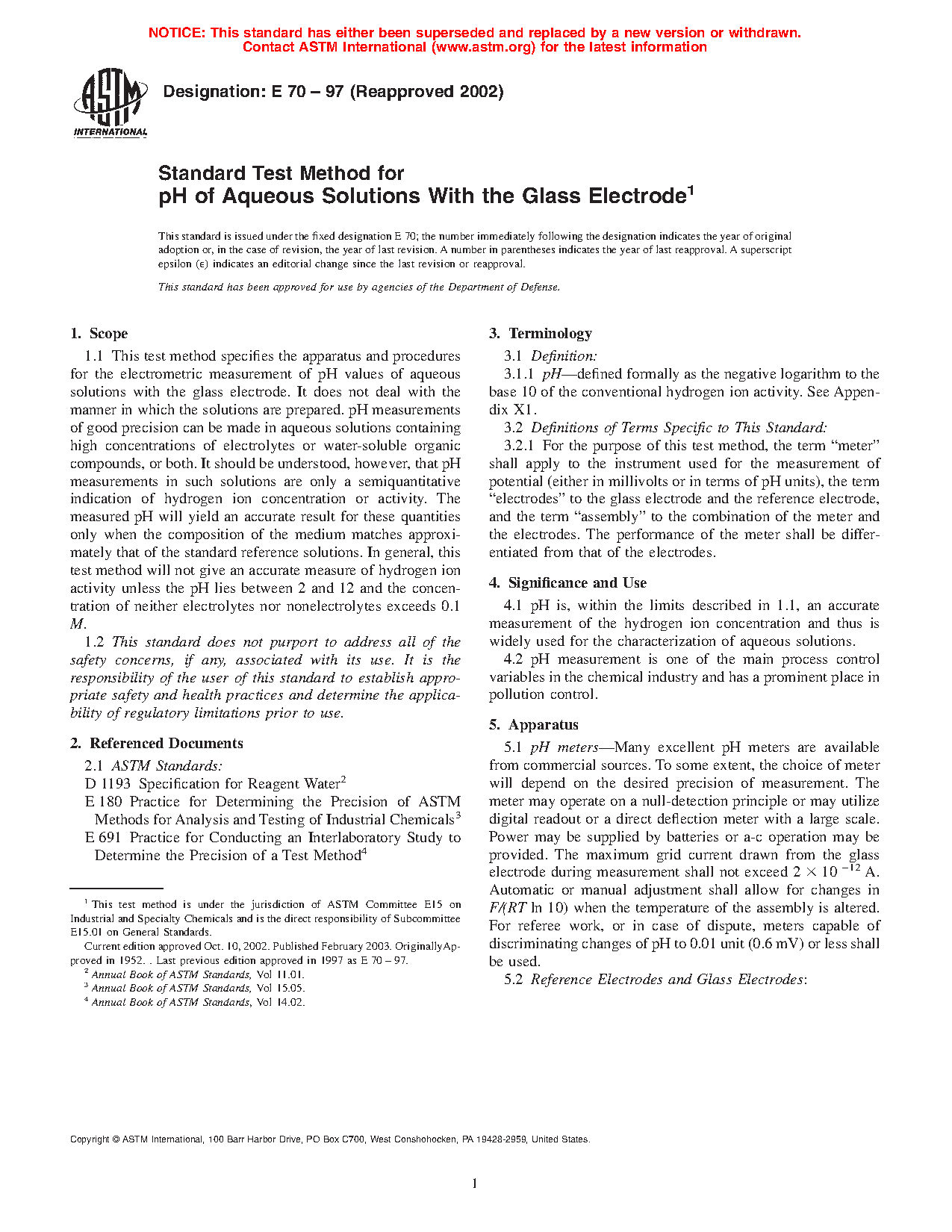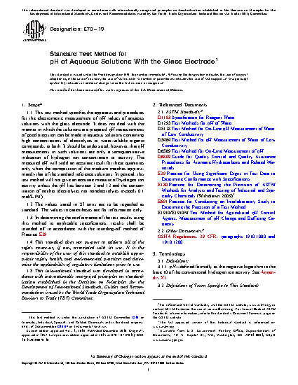 1.1 This test method specifies the apparatus and procedures for the electrometric measurement of pH values of aqueous solutions with the glass electrode. It does not deal with the manner in which the solutions are prepared. pH measurements of good precision can be made in aqueous solutions containing high concentrations of electrolytes or water-soluble organic compounds, or both. It should be understood, however, that pH measurements in such solutions are only a semiquantitative indication of hydrogen ion concentration or activity. The measured pH will yield an accurate result for these quantities only when the composition of the medium matches approximately that of the standard reference solutions. In general, this test method will not give an accurate measure of hydrogen ion activity unless the pH lies between 2 and 12 and the concentration of neither electrolytes nor nonelectrolytes exceeds 0.1 M.
