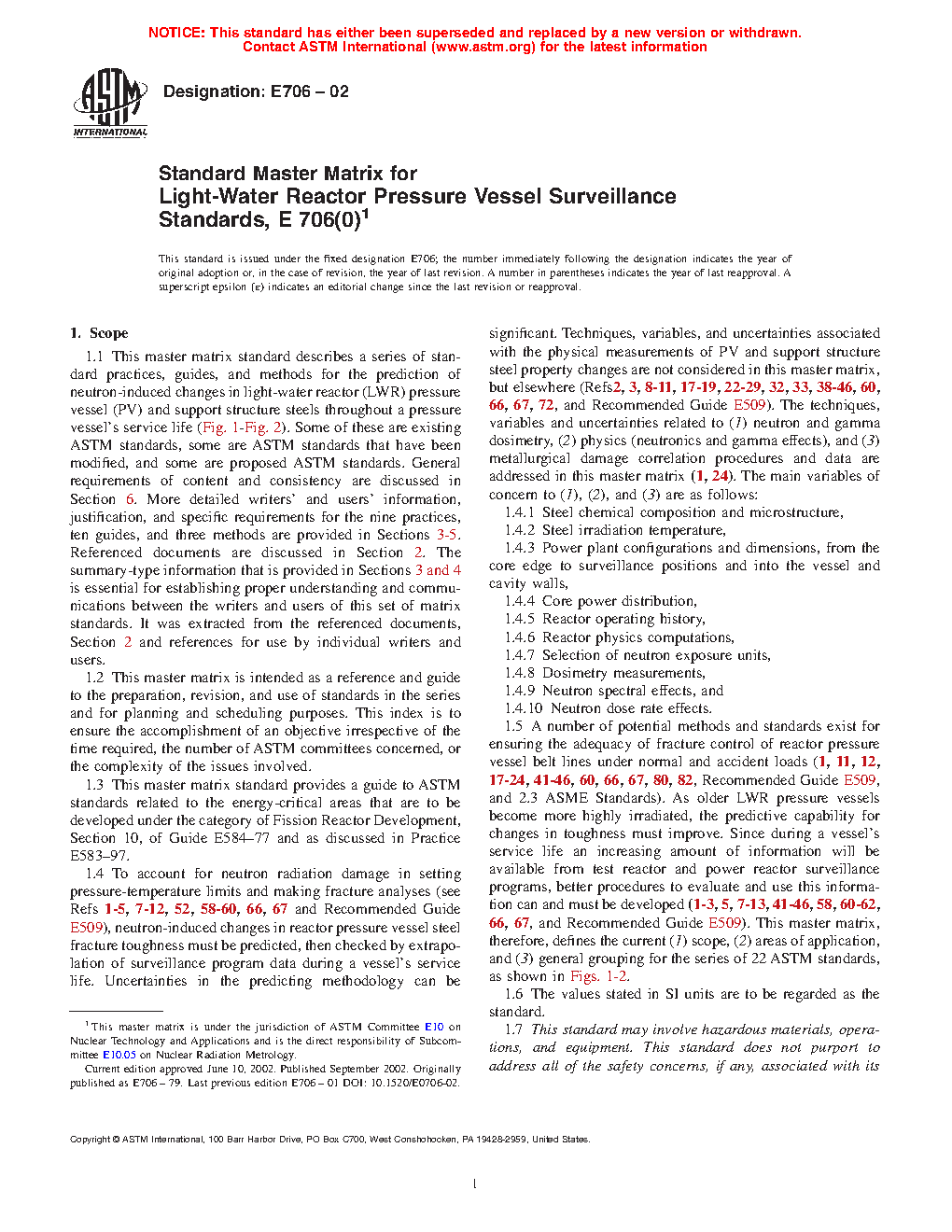 1.1 This master matrix standard describes a series of standard practices, guides, and methods for the prediction of neutron-induced changes in light-water reactor (LWR) pressure vessel (PV) and support structure steels throughout a pressure vessel’s service life (Fig. 1). Referenced documents are listed in Section 2. The summary information that is provided in Sections 3 and 4 is essential for establishing proper understanding and communications between the writers and users of this set of matrix standards. It was extracted from the referenced standards (Section 2) and references for use by individual writers and users. More detailed writers’ and users’ information, justification, and specific requirements for the individual practices, guides, and methods are provided in Sections 3 – 5. General requirements of content and consistency are discussed in Section 6.