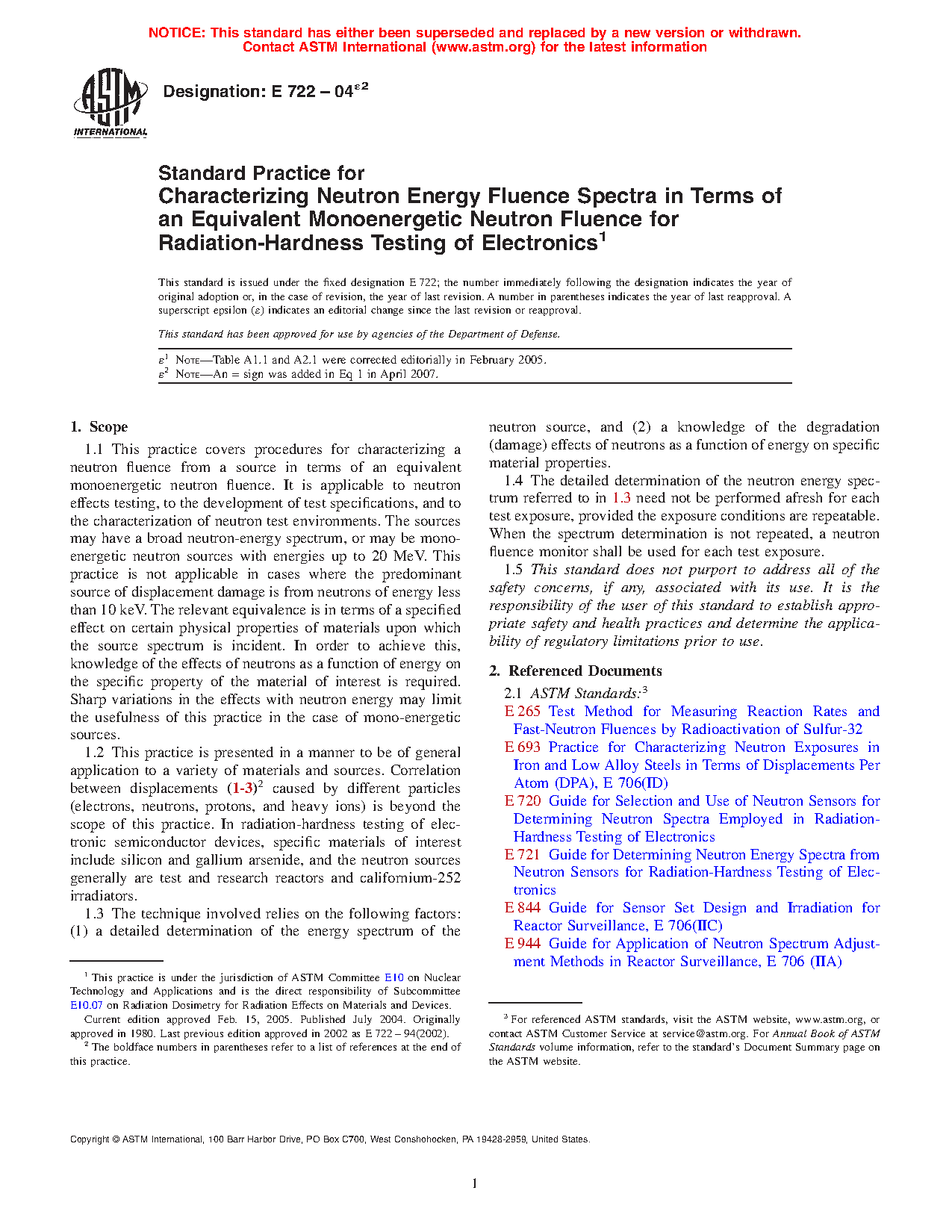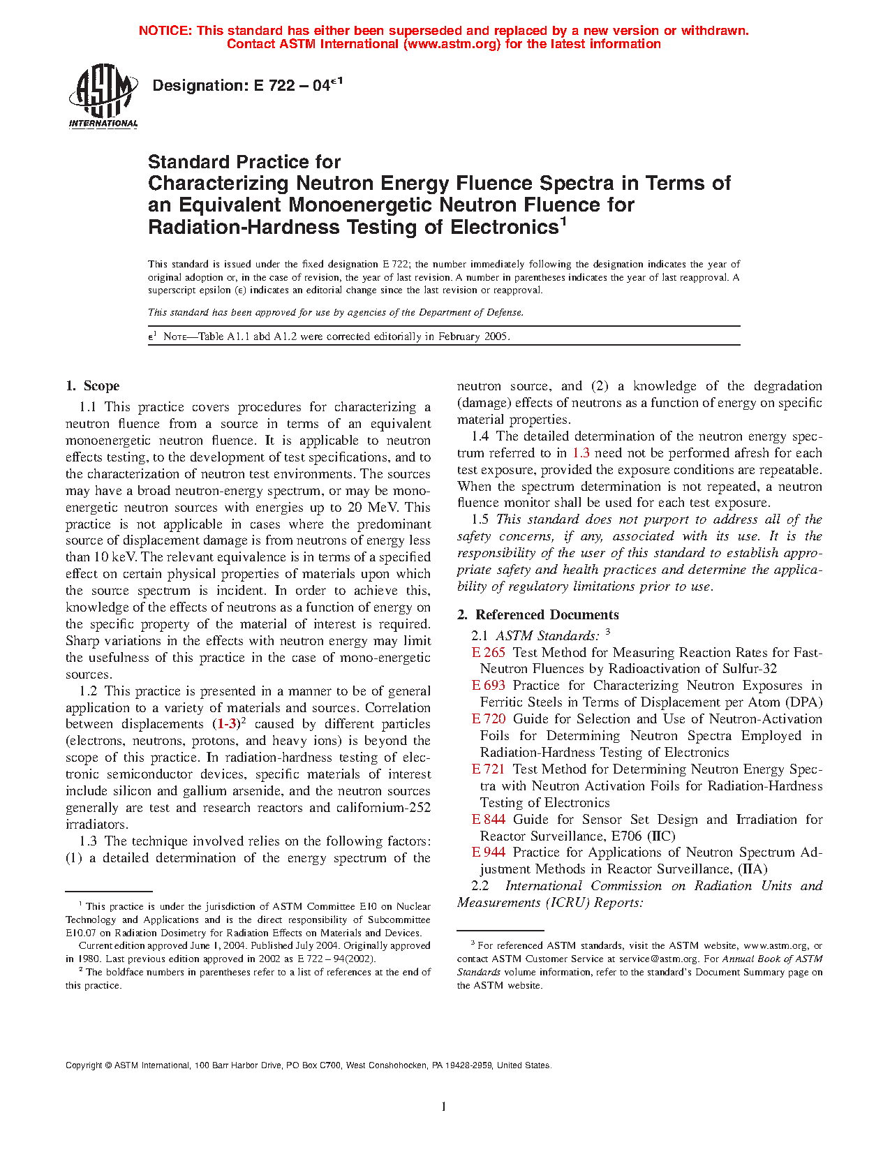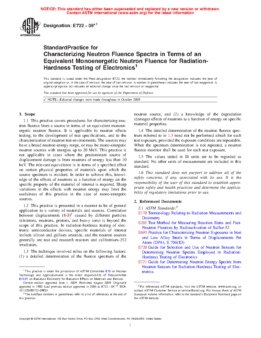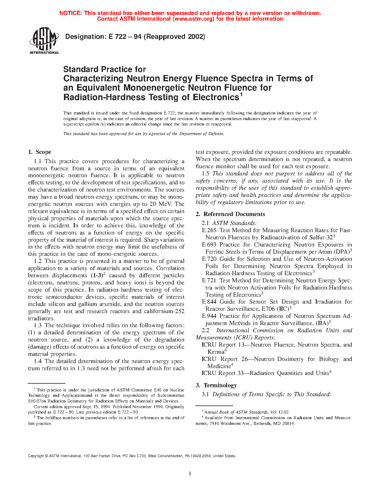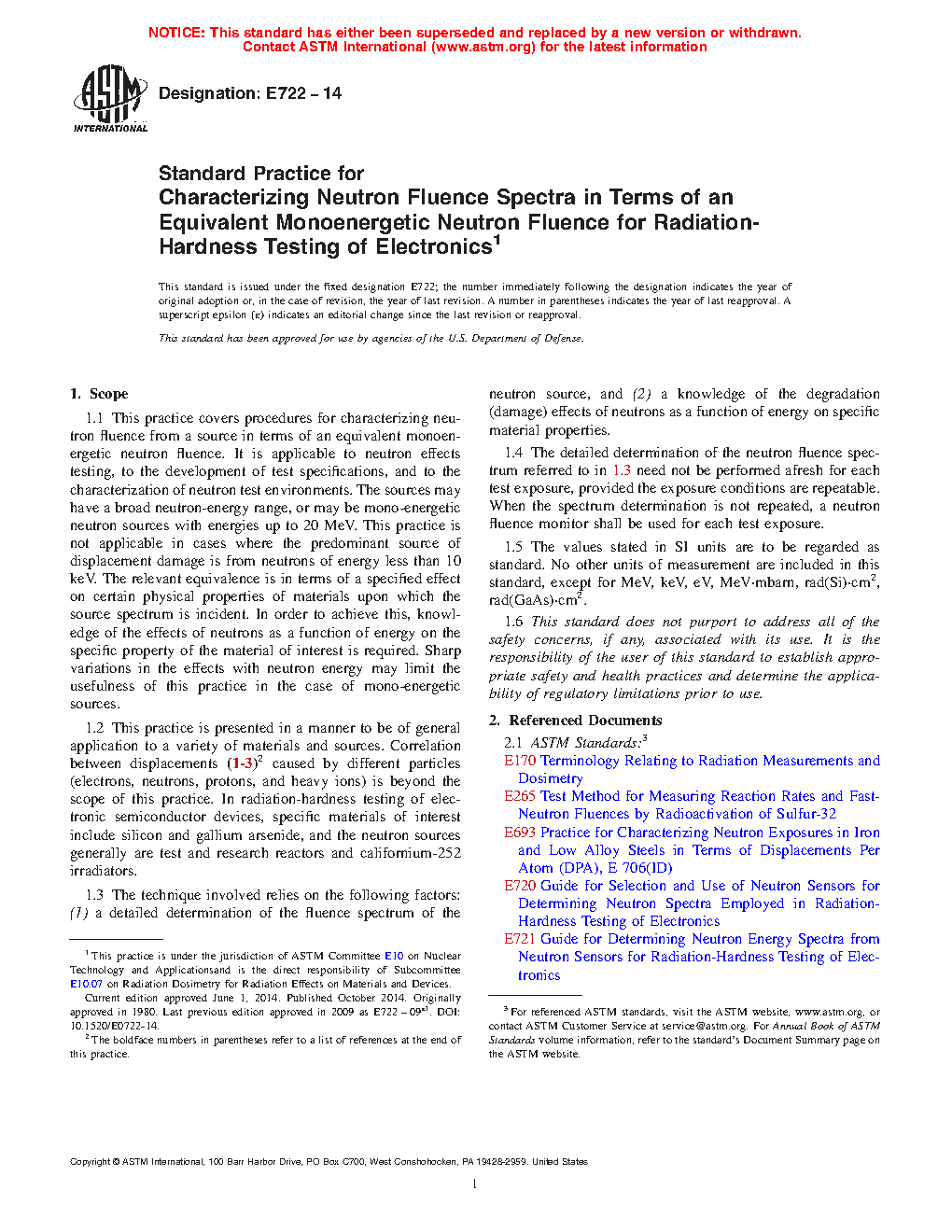 1.1 This practice covers procedures for characterizing neutron fluence from a source in terms of an equivalent monoenergetic neutron fluence. It is applicable to neutron effects testing, to the development of test specifications, and to the characterization of neutron test environments. The sources may have a broad neutron-energy range, or may be mono-energetic neutron sources with energies up to 20 MeV. This practice is not applicable in cases where the predominant source of displacement damage is from neutrons of energy less than 10 keV. The relevant equivalence is in terms of a specified effect on certain physical properties of materials upon which the source spectrum is incident. In order to achieve this, knowledge of the effects of neutrons as a function of energy on the specific property of the material of interest is required. Sharp variations in the effects with neutron energy may limit the usefulness of this practice in the case of mono-energetic sources.