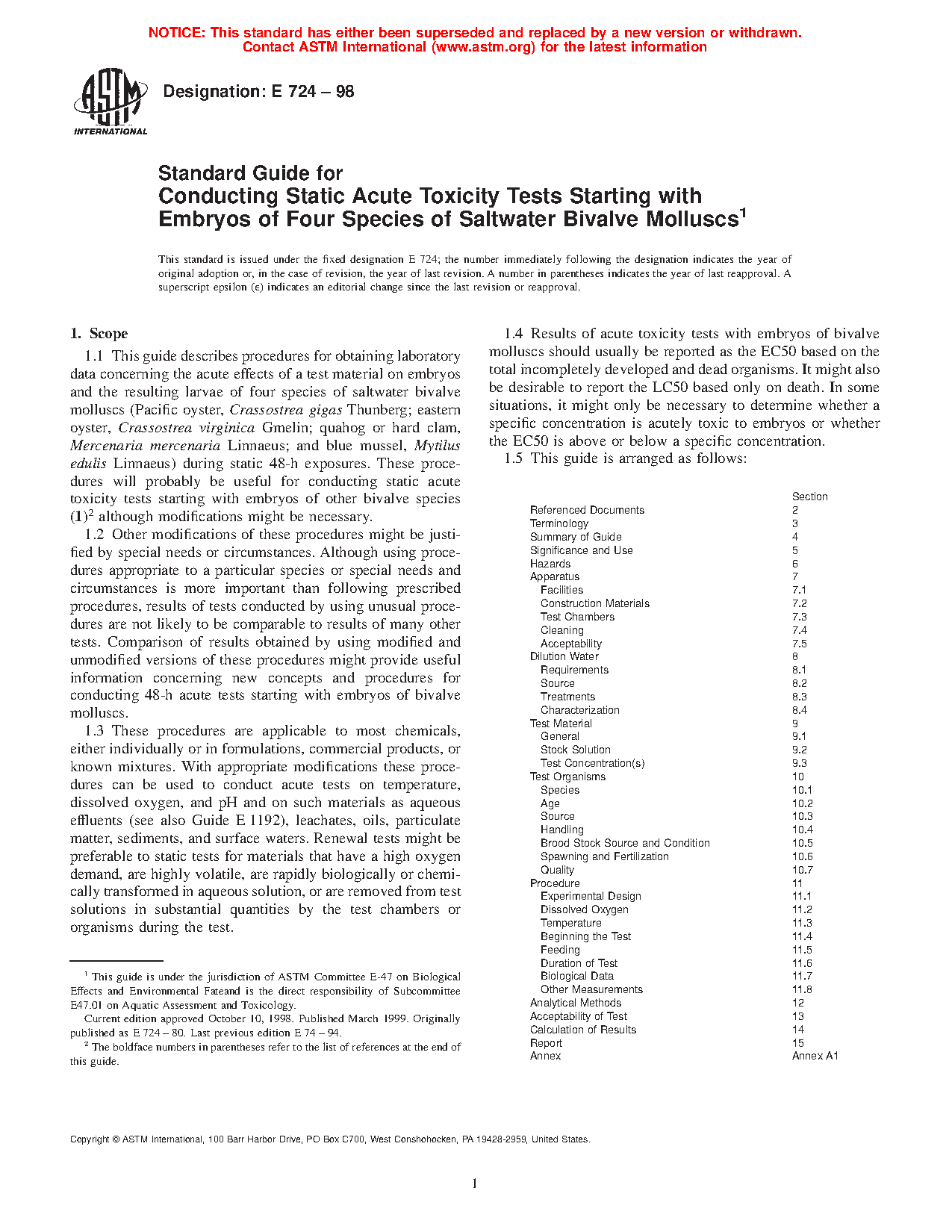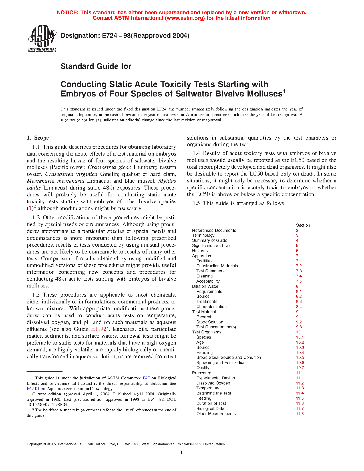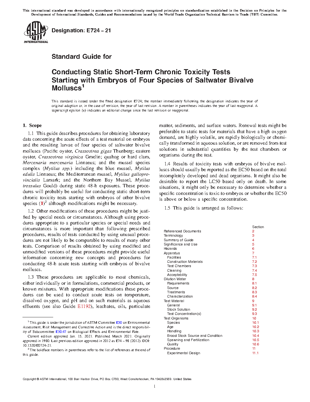 Section Referenced Documents 2 Terminology 3 Summary of Standard 4 Significance and Use 5 Apparatus 6 Facilities 6.1 Construction Materials 6.2 Test Chambers 6.3 Cleaning 6.4 Acceptability 6.5 Hazards 7 Dilution Water 8 Requirements 8.1 Source 8.2 Treatment 8.3 Characterization 8.4 Test Material 9 General 9.1 Stock Solution 9.2 Test Concentration(s) 9.3 Test Organisms 10 Species 10.1 Age 10.2 Source 10.3 Handling 10.4 Brood Stock Source and Condition 10.5 Spawning and Fertilization 10.6 Quality 10.7 Procedure 11 Experimental Design 11.1 Dissolved Oxygen 11.2 Temperature 11.3 Beginning the Test 11.4 Feeding 11.5 Duration of Test 11.6 Biological Data 11.7 Other Measurements 11.8 Analytical Methods 12 Acceptability of Test 13 Calculation of Results 14 Report 151.6 This standard does not purport to address all of the safety concerns, if any, associated with its use. It is the responsibility of the user of this standard to establish appropriate safety and health practices and determine the applicability of regulatory limitations prior to use. Specific hazard statements are given in Section 6.
