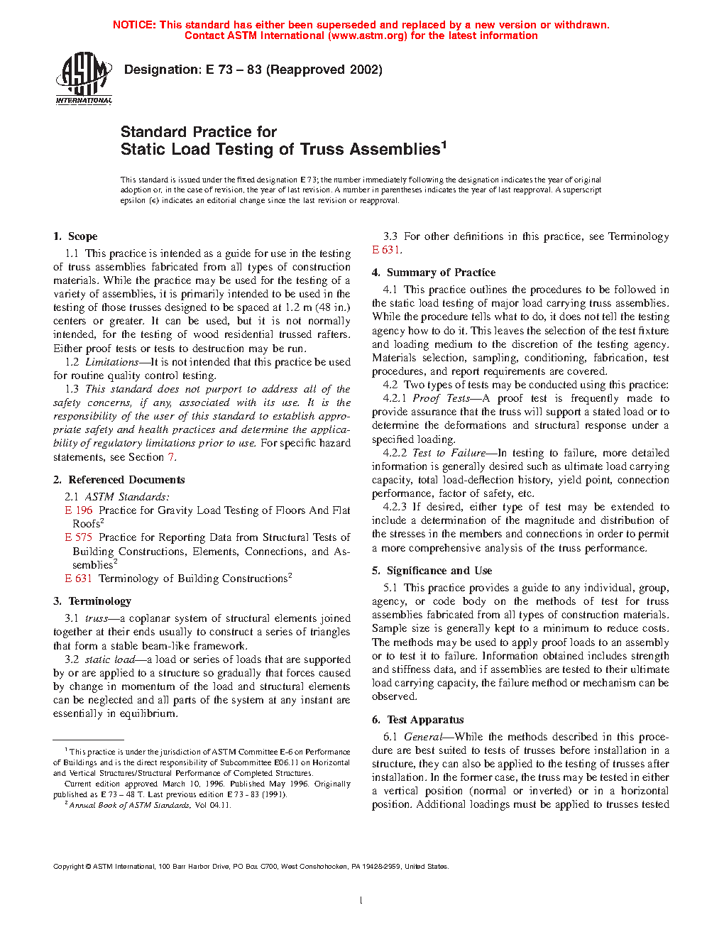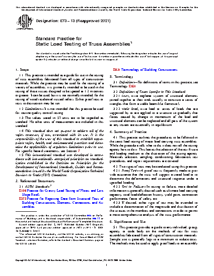 1.1 This practice is intended as a guide for use in the testing of truss assemblies fabricated from all types of construction materials. While the practice may be used for the testing of a variety of assemblies, it is primarily intended to be used in the testing of those trusses designed to be spaced at 1.2 m centers or greater. It can be used, but it is not normally intended, for the testing of wood residential trussed rafters. Either proof tests or tests to destruction may be run.