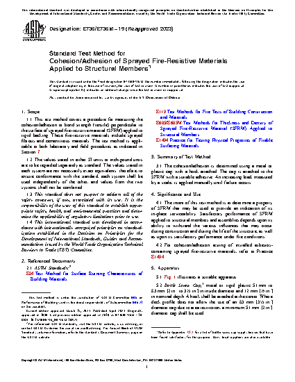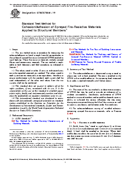1.1 This test method covers a procedure for measuring the cohesion/adhesion or bond strength (tensile) perpendicular to the surface of sprayed fire-resistive material (SFRM) applied to rigid backing. These fire-resistive materials include sprayed fibrous and cementitious materials. The test method is applicable to both laboratory and field procedures as indicated in Section 7.