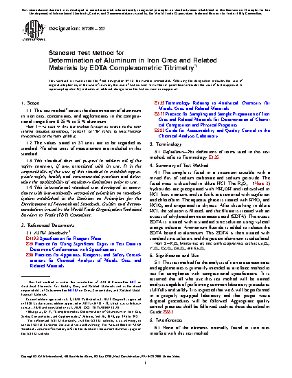 1.1 This test method covers the determination of aluminum in iron ores, concentrates, and agglomerates in the compositional range from 0.25 % to 5 % aluminum.