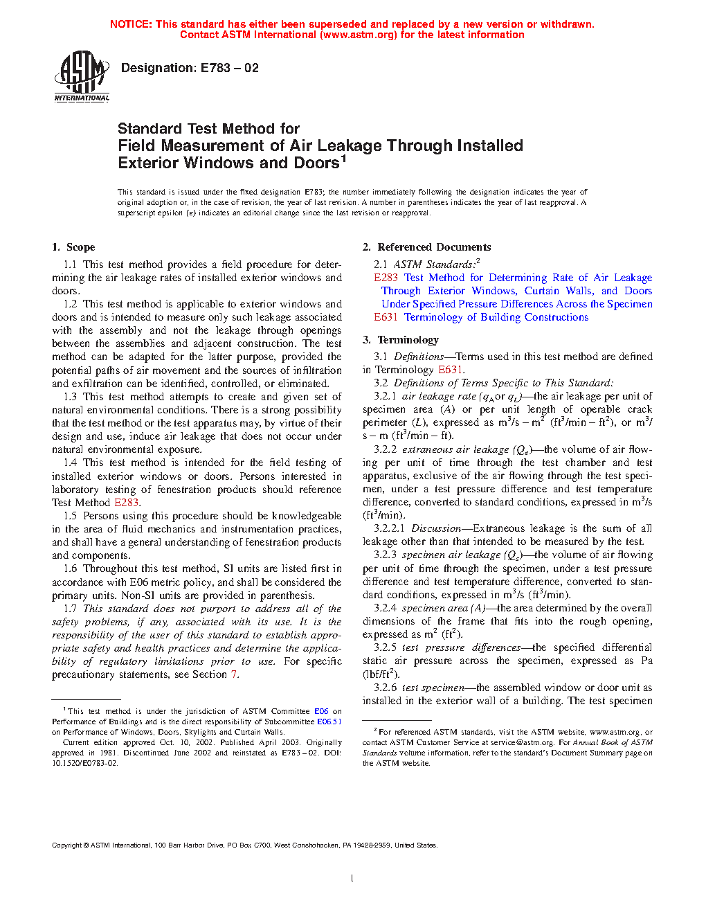 1.4 This test method is intended for the field testing of installed exterior windows or doors. Persons interested in laboratory testing of fenestration products should reference Test Method E283.