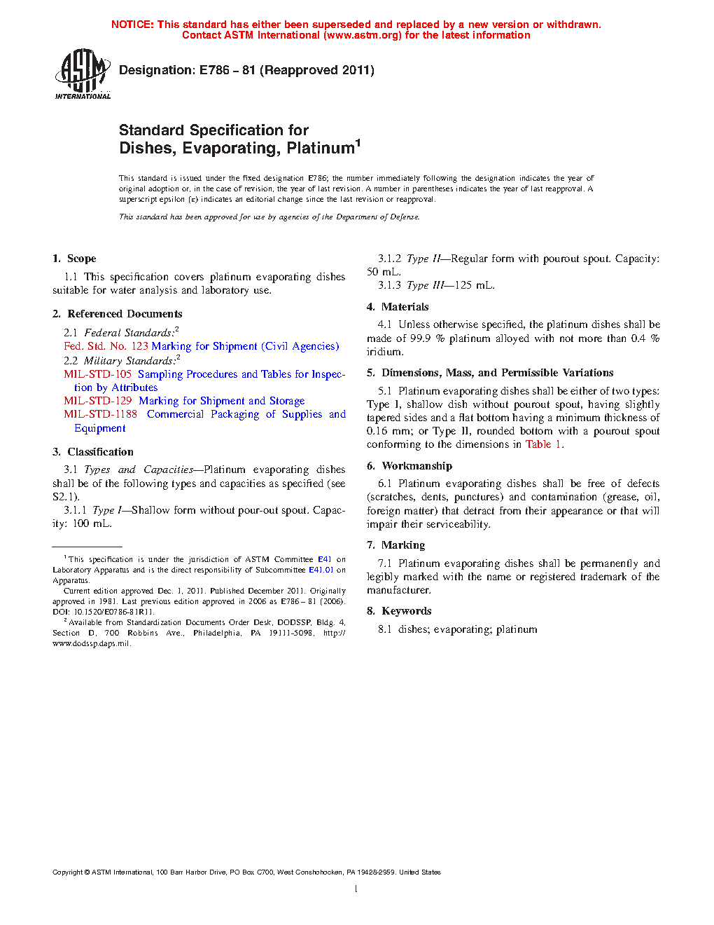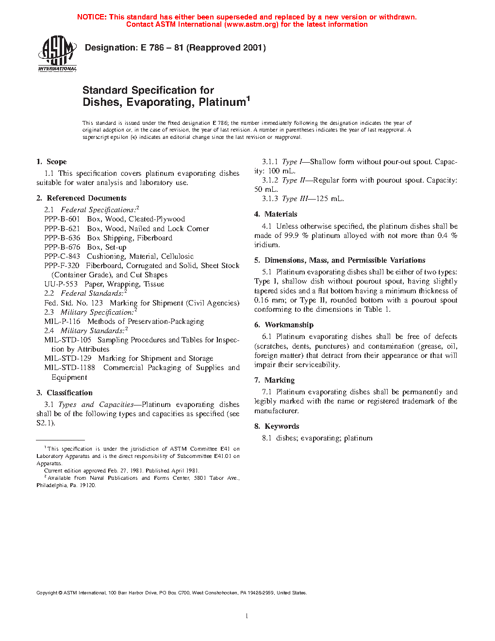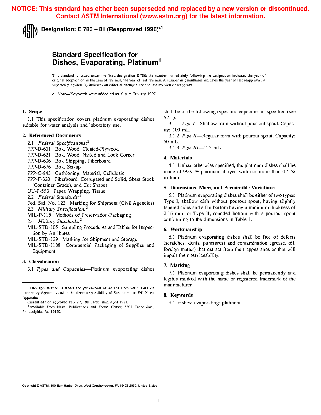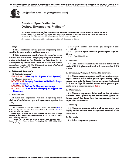 This specification covers platinum evaporating dishes suitable for water analysis and laboratory use. Platinum evaporating dishes shall be of the following types and capacities: Type I; Type II; and Type III.