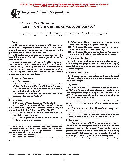 1.1 This test method covers determination of the ash content in the analysis sample of refuse-derived fuel (RDF). The results obtained can be applied as the weight percent ash in the proximate analysis and in the ultimate analysis.