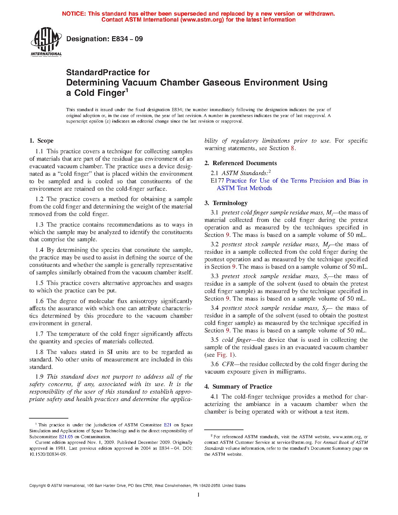 1.1 This practice covers a technique for collecting samples of materials that are part of the residual gas environment of an evacuated vacuum chamber. The practice uses a device designated as a “cold finger” that is placed within the environment to be sampled and is cooled so that constituents of the environment are retained on the cold-finger surface.