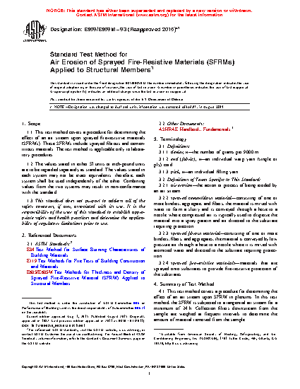 5.2 Air erosion tests on SFRMs are conducted to evaluate the behavior of the SFRM when subjected to plenum air streams during normal service conditions. Such tests evaluate the resistance to dusting, flaking, spalling, and delamination of the SFRM.