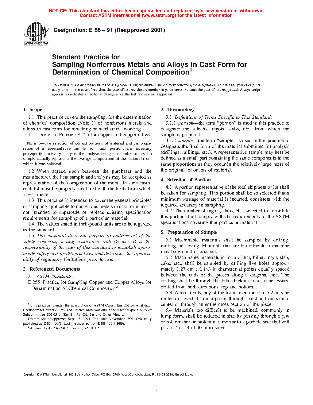 1.3 This practice is intended to cover the general principles of sampling applicable to nonferrous metals in cast form and is not intended to supersede or replace existing specification requirements for sampling of a particular material.