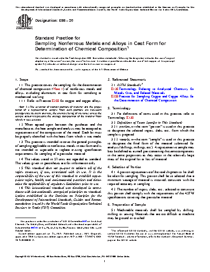 1.1 This practice covers the sampling, for the determination of chemical composition (Note 1) of nonferrous metals and alloys, excluding aluminum, in cast form for remelting or mechanical working.