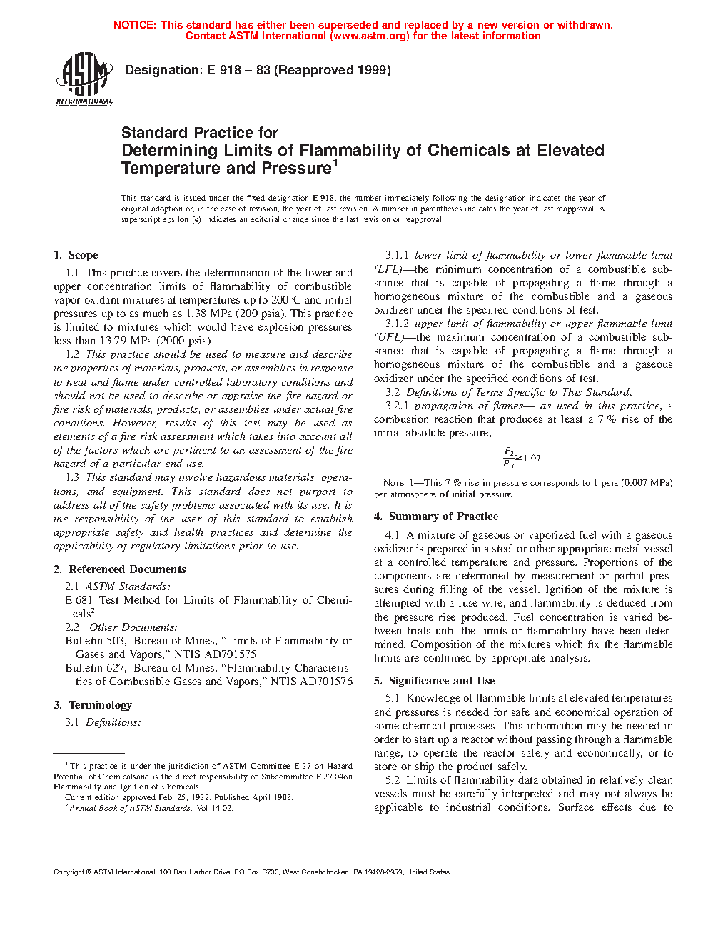 1.1 This practice covers the determination of the lower and upper concentration limits of flammability of combustible vapor-oxidant mixtures at temperatures up to 200°C and initial pressures up to as much as 1.38 MPa (200 psia). This practice is limited to mixtures which would have explosion pressures less than 13.79 MPa (2000 psia).