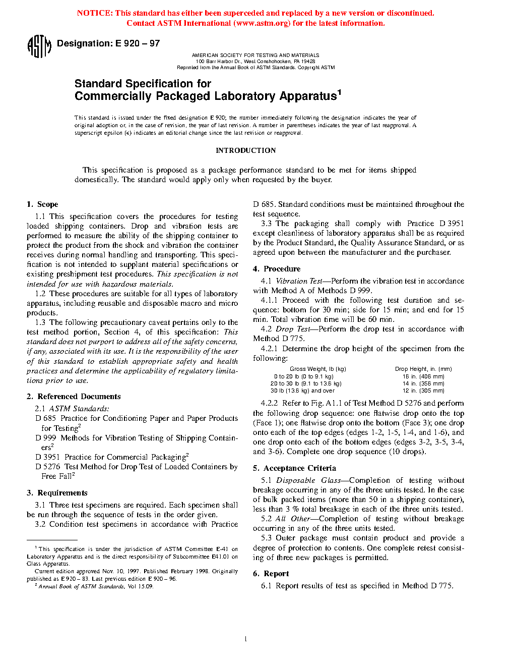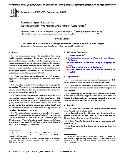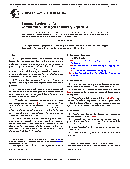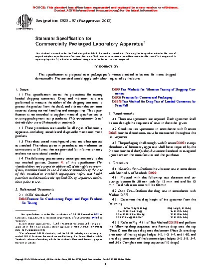 This specification covers the procedures for testing loaded shipping containers. Drop and vibration tests are performed to measure the ability of the shipping container to protect the product from the shock and vibration the container receives during normal handling and transporting. This specification is not intended for use with hazardous materials. The procedures are suitable for all types of laboratory apparatus, including reusable and disposable macro and micro products.