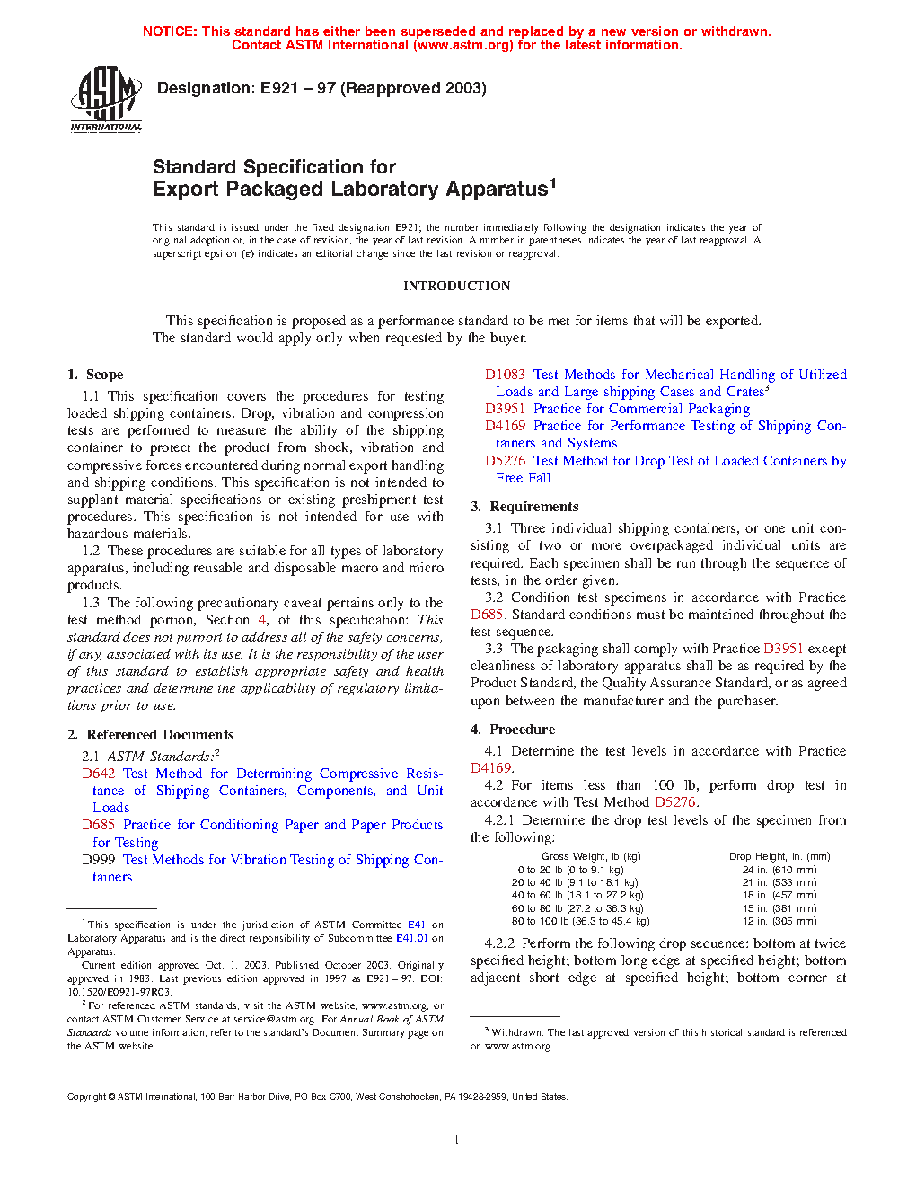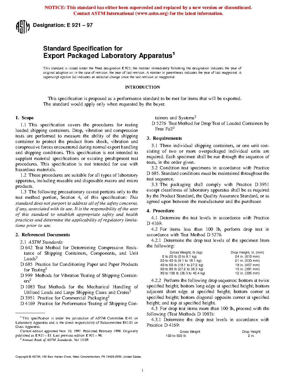 This specification covers the requirements, acceptable criteria, and testing procedures for examining loaded shipping containers. Drop, vibration, and compression tests shall be performed to measure the ability of the shipping container to protect the product from shock, vibration, and compression forces encountered during normal export handling and shipping conditions. This specification is not intended to supplant material specifications or existing preshipment test procedures, and is not intended for use with hazardous materials as well.