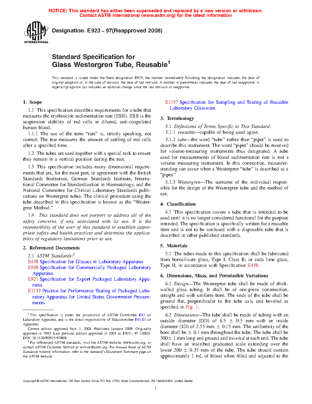 1.3 This specification includes many dimensional requirements that are, for the most part, in agreement with the British Standards Institution, German Standards Institute, International Committee for Standardization in Haematology, and the National Committee for Clinical Laboratory Standards publications on Westergren tubes. The clinical procedure using the tube described in this specification is known as the “Westergren Method.”