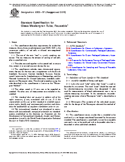 This specification covers the design and dimensional requirements for reusable glass Westergren tubes that measure the erythrocyte sedimentation rate (ESR), which is the suspension stability, or amount of settling after a specified time, of red blood cells in diluted, anti-coagulated human blood. The tubes shall be fabricated from Type I, Class B borosilicate glass, or Type II soda lime glass. Tubes shall comply with requirements for graduation line length and numbering, marking permanency, grinding bevel, and workmanship. The tubes should also pass a pigmentation and amber stain test.