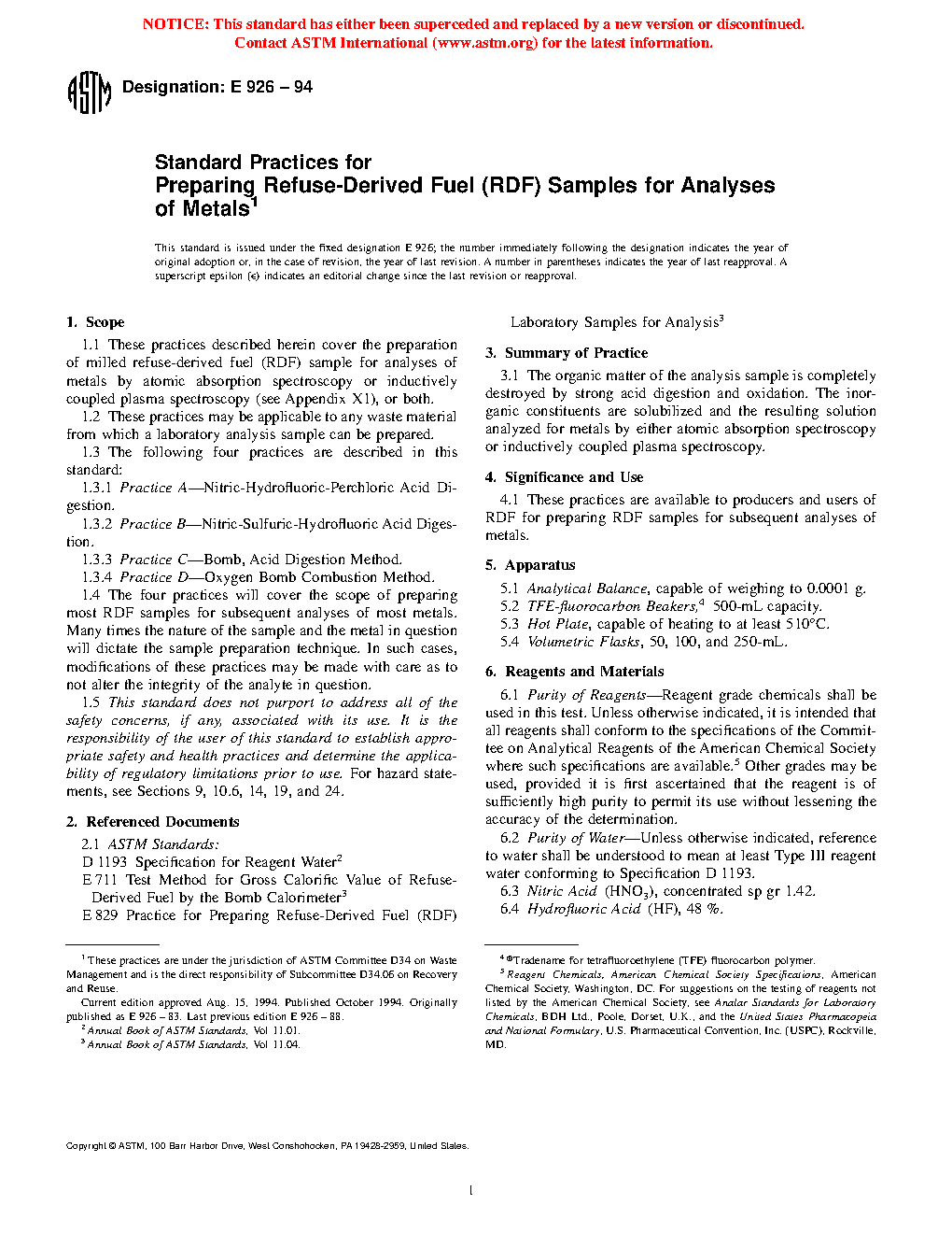 1.1 These practices described herein cover the preparation of milled refuse-derived fuel (RDF) sample for analyses of metals by atomic absorption spectroscopy or inductively coupled plasma spectroscopy (see Appendix X1), or both.
