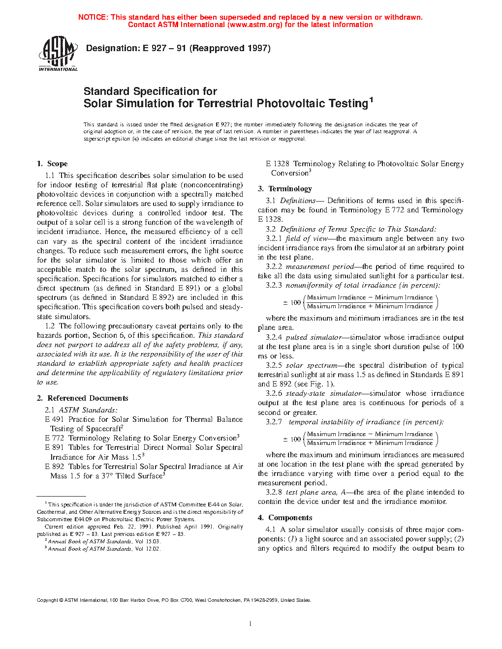1.6 Spectral irradiance classifications are provided for Air Mass 1.5 direct and global (as defined in Tables G 173), or Air Mass 0 (AM0, as defined in Standard E 490).