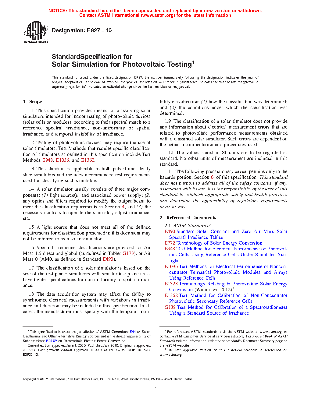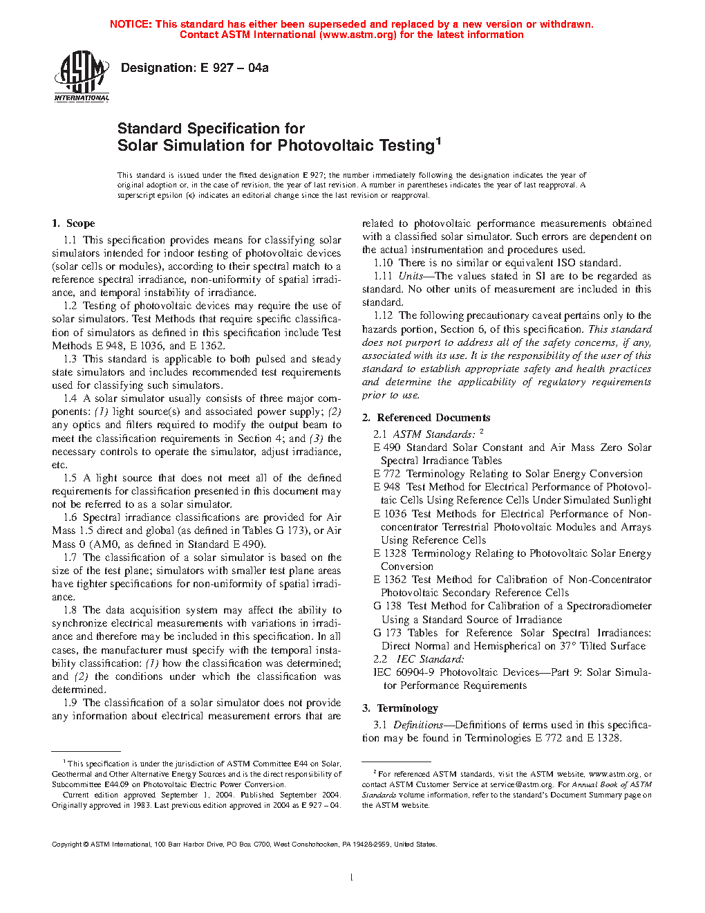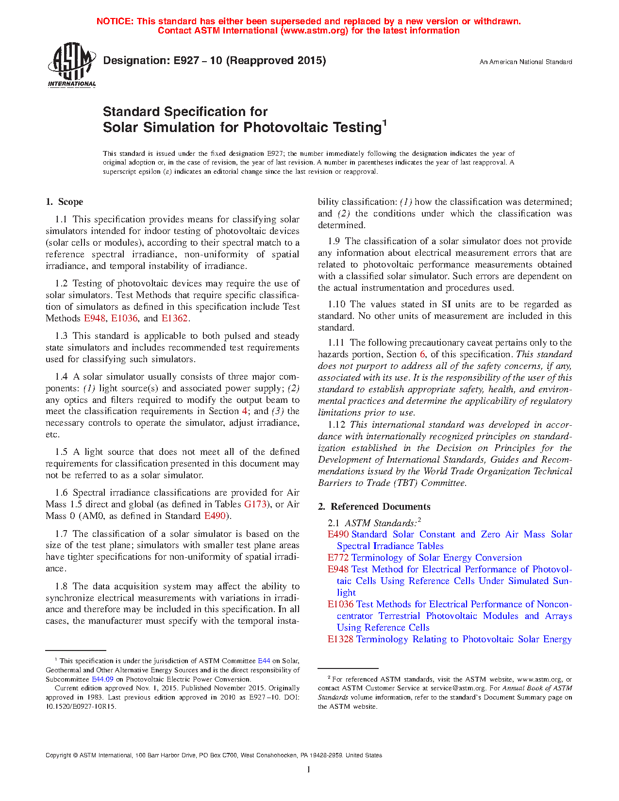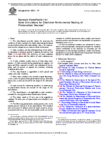 1.2 Testing of photovoltaic devices may require the use of solar simulators. Test Methods that require specific classification of simulators as defined in this specification include Test Methods E 948, E 1036, and E 1362.