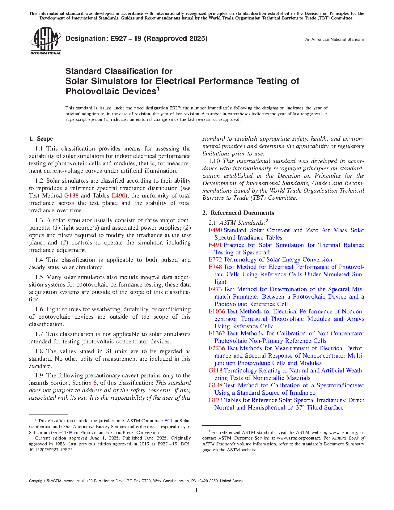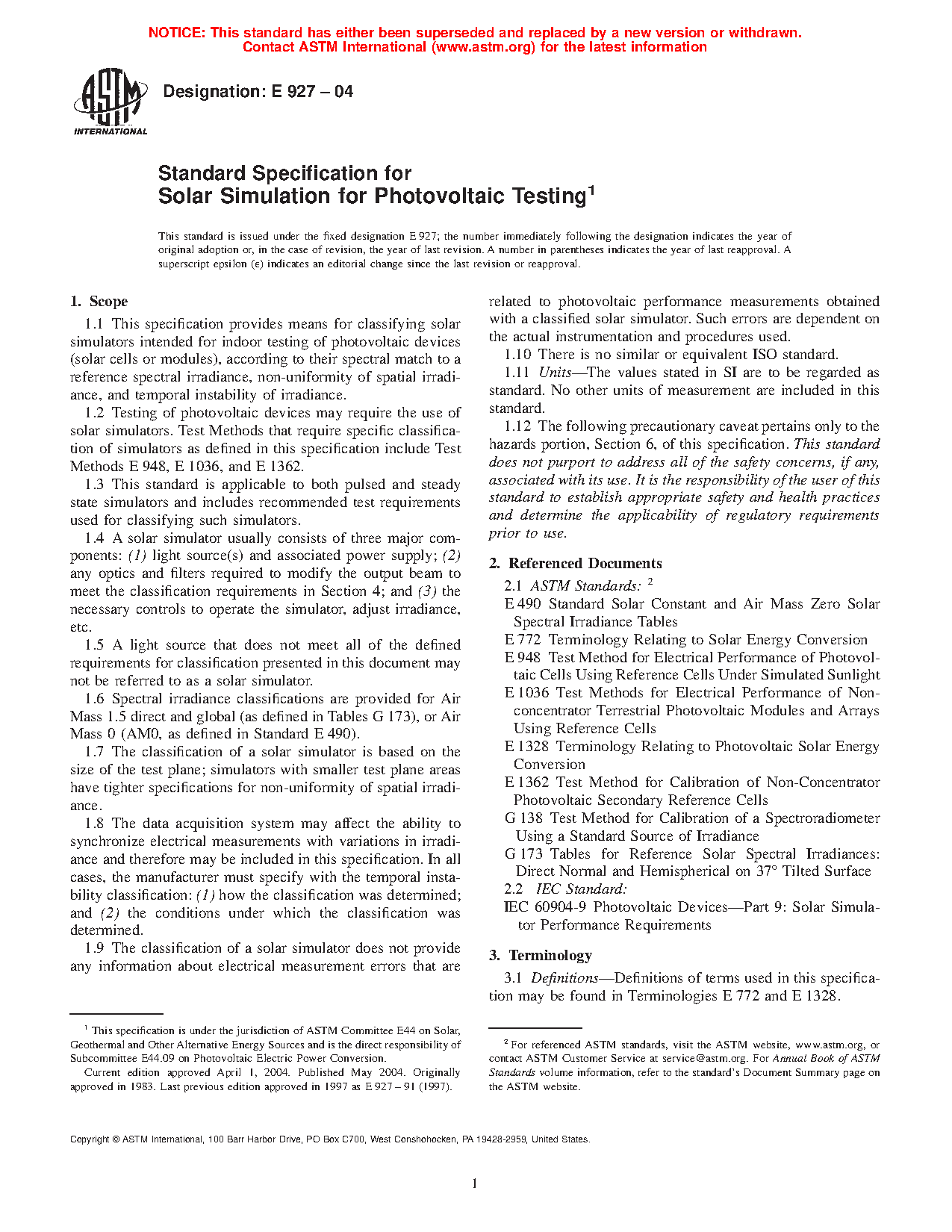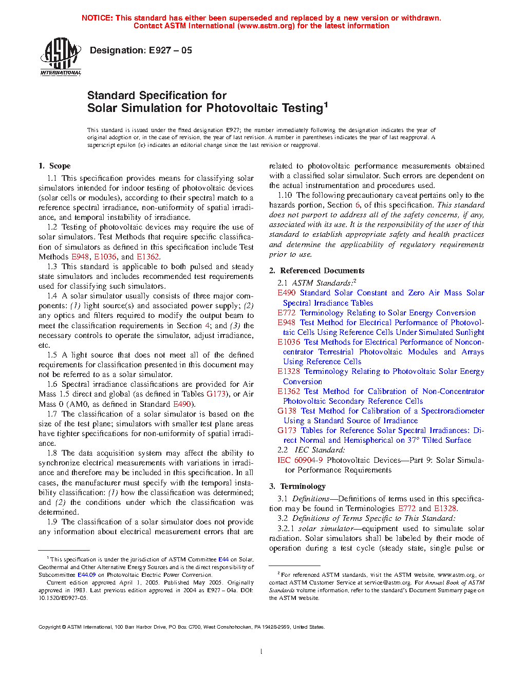 1.2 Testing of photovoltaic devices may require the use of solar simulators. Test Methods that require specific classification of simulators as defined in this specification include Test Methods E 948, E 1036, and E 1362.
