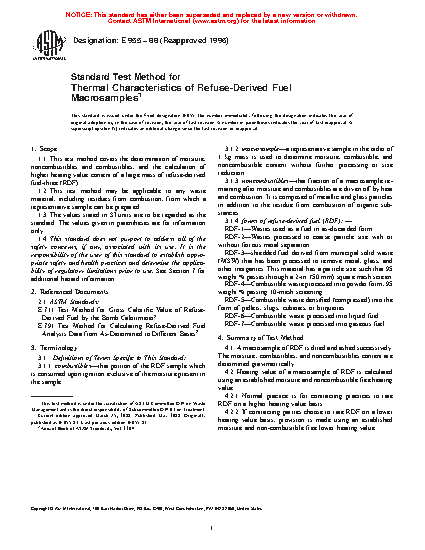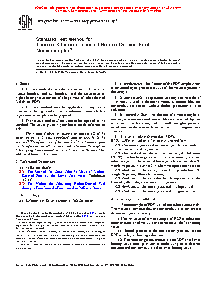 1.1 This test method covers the determination of moisture, noncombustibles and combustibles, and the calculation of higher heating value content of a large mass of refuse-derived fuel-three (RDF).