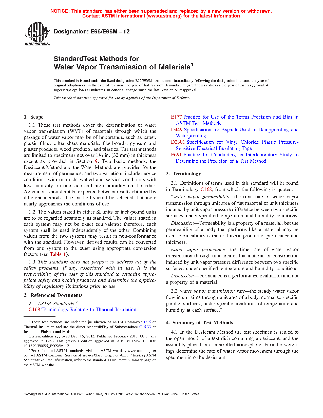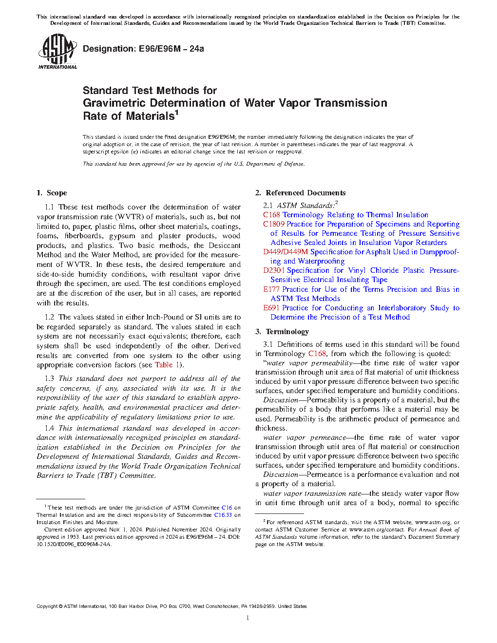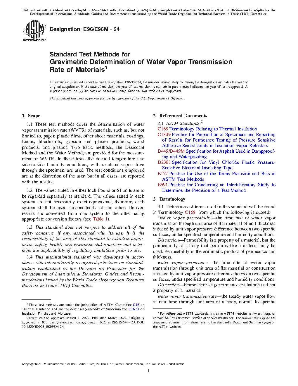 1.1 These test methods cover the determination of water vapor transmission (WVT) of materials through which the passage of water vapor may be of importance, such as paper, plastic films, other sheet materials, fiberboards, gypsum and plaster products, wood products, and plastics. The test methods are limited to specimens not over 11/4 in. [32 mm] in thickness except as provided in Section 9. Two basic methods, the Desiccant Method and the Water Method, are provided for the measurement of permeance, and two variations include service conditions with one side wetted and service conditions with low humidity on one side and high humidity on the other. Agreement should not be expected between results obtained by different methods. The method should be selected that more nearly approaches the conditions of use.