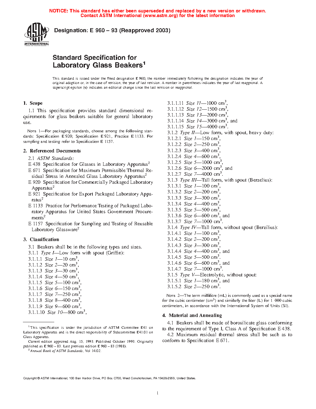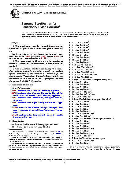 This specification provides standard dimensional requirements for glass beakers suitable for general laboratory use. The glass beakers are classified into types and sizes and are presented in details. The glass beaker types are: type I - low form with spout; type II - low form, with spout heavy duty; type III - tall form, with spout; type IV - tall form, without spout; and type V - electrolytic, without spout. Beakers shall be made of borosilicate glass conforming to the requirement specified. Types I and II beakers shall be constructed to have straight sides. Types III and IV beakers shall have slightly tapered sides. Type V beakers may have slightly tapered or straight sides.