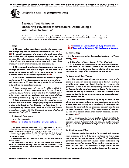 1.1 This test method describes a procedure for determining the average depth of pavement surface macrotexture (see 3.1) (1)2 by careful application of a known volume of material on the surface and subsequent measurement of the total area covered. The technique is designed to provide an average depth value of only the pavement macrotexture and is considered insensitive to pavement microtexture characteristics.