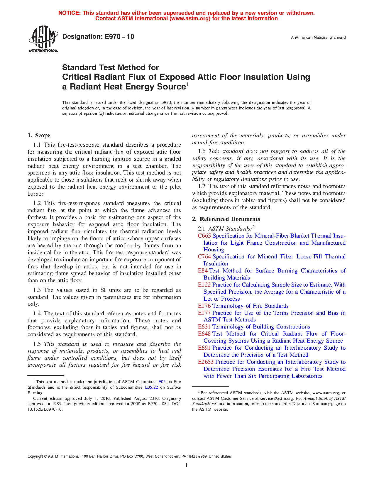 1.1 This fire-test-response standard describes a procedure for measuring the critical radiant flux of exposed attic floor insulation subjected to a flaming ignition source in a graded radiant heat energy environment in a test chamber. The specimen is any attic floor insulation. This test method is not applicable to those insulations that melt or shrink away when exposed to the radiant heat energy environment or the pilot burner.
