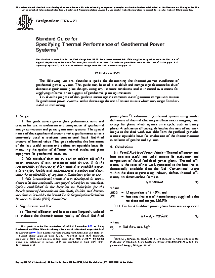 1.1 This guide covers power plant performance terms and criteria for use in evaluation and comparison of geothermal energy conversion and power generation systems. The special nature of these geothermal systems makes performance criteria commonly used to evaluate conventional fossil fuel-fired systems of limited value. This guide identifies the limitations of the less useful criteria and defines an equitable basis for measuring the quality of differing thermal cycles and plant equipment for geothermal resources.