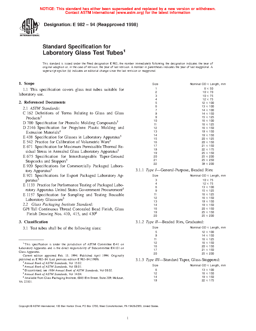 This specification covers glass test tubes suitable for laboratory use. The test tubes shall be of the following classification according to size: Type I, Type II, Type III, Type IV (Class A, Class B, and Class C), Type V, Type VI, and Type VII. Test tubes shall be made of the prescribed borosilicate glass (Type I glass) or of soda-lime glass (Type II glass) and shall be tubular, with one end having a rounded closure. The following are specified: (1) material requirements for screw caps, liners, and annealing and (2) design requirements for the test tube capacity, dimensions (OD, length, and wall thickness), and area for marking. Other dimensional requirements such as subdivision, stopper, and GPI thread finish are also specified.