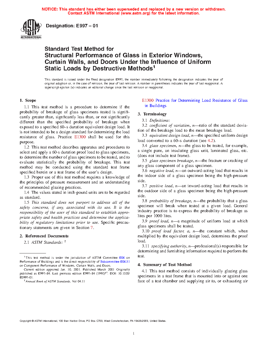 1.1 This test method is a procedure to determine if the probability of breakage of glass specimens tested is significantly greater than, significantly less than, or not significantly different than the specified probability of breakage when exposed to a specified design load. It is not intended to be a design standard for determining the load resistance of glass. Practice E1300 shall be used for this purpose.