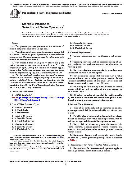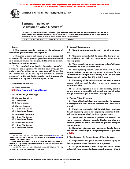 This practice provides guidance in the selection of manual and power-actuated valve operators. The selection criteria for manual valve operators apply to handwheels and tee-wrenches. The selection criteria for power-actuated valve operators, on the other hand, apply to stem nut and handwheel driven valve operators of the electric, pneumatic, and hydraulic types.