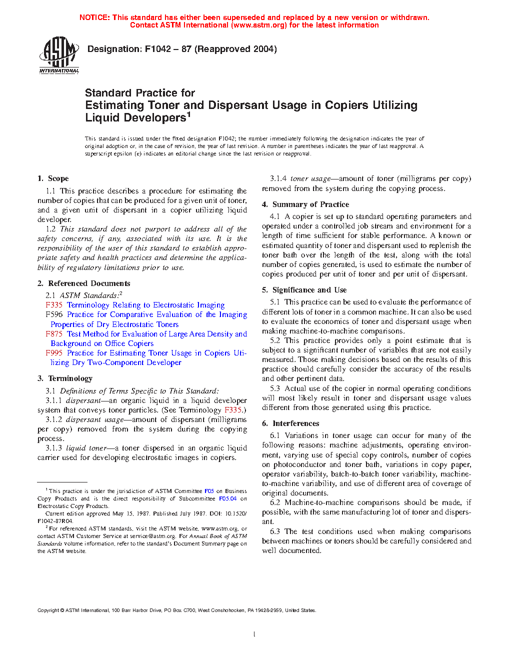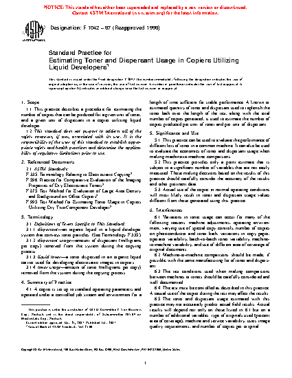 1.1 This practice describes a procedure for estimating the number of copies that can be produced for a given unit of toner, and a given unit of dispersant in a copier utilizing liquid developer.