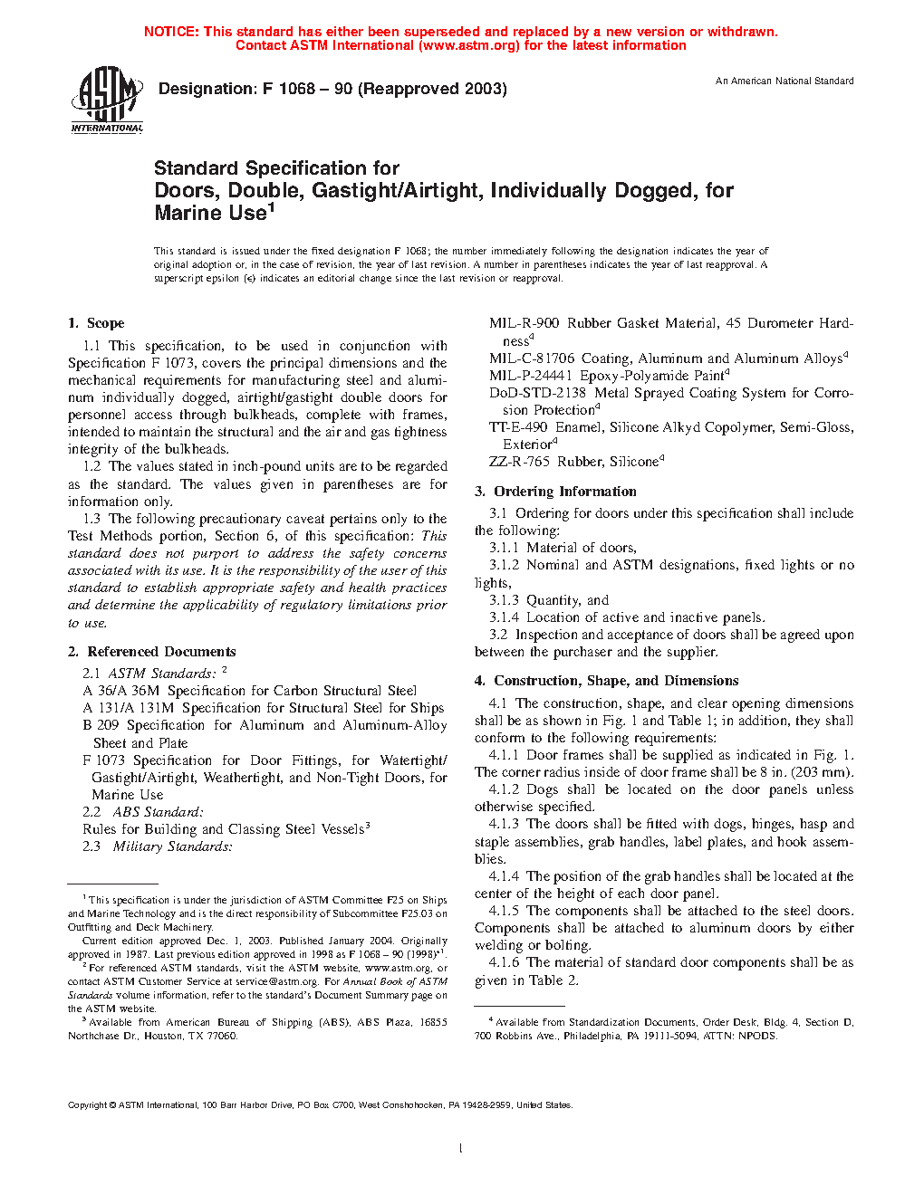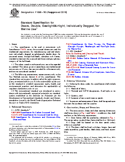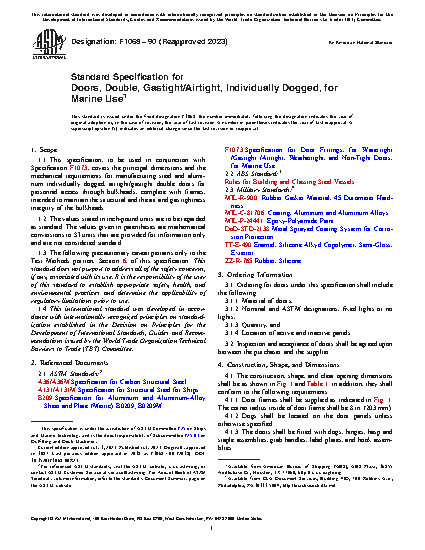 1.1 This specification, to be used in conjunction with Specification F 1073, covers the principal dimensions and the mechanical requirements for manufacturing steel and aluminum individually dogged, airtight/gastight double doors for personnel access through bulkheads, complete with frames, intended to maintain the structural and the air and gas tightness integrity of the bulkheads.