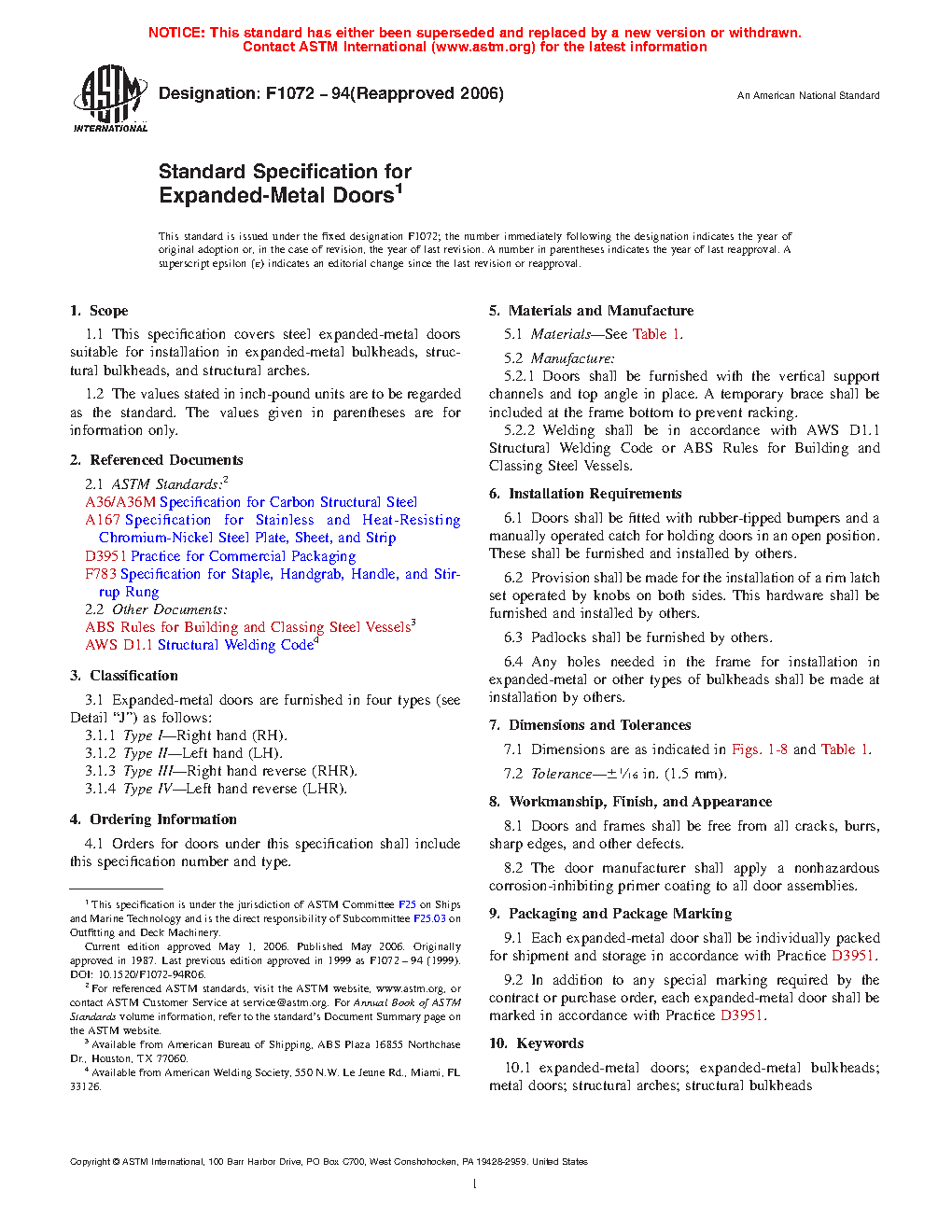 This specification covers steel expanded-metal doors suitable for installation in expanded-metal bulkheads, structural bulkheads, and structural arches. Expanded-metal doors are furnished in four types: Type I (right hand), Type II (left hand), Type III (right hand reverse) and Type IV (left hand reverse). Doors shall be furnished with the vertical support channels and top angle in place. A temporary brace shall be included at the frame bottom to prevent racking. Doors shall be fitted with rubber-tipped bumpers and a manually operated catch for holding doors in an open position. Provision shall be made for the installation of a rim latch set operated by knobs on both sides. Doors and frames shall be free from all cracks, burrs, sharp edges, and other defects.
