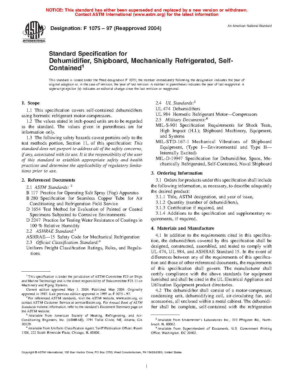 This specification covers the performance requirements and corresponding test procedures for self-contained shipboard dehumidifiers that use hermetic refrigerant motor-compressors. The components of the dehumidifier, including the motor-compressor, condensing unit, dehumidifying coil, air-circulating fan, and accessories, shall all be enclosed within a metal cabinet. Dehumidifiers shall be evaluated by design capacity test, overload test, inclination test, and corrosion resistance test, and should operate satisfactorily as specified. Requirements for design documentation, schematic drawings, and manufacturer's manual are also considered.