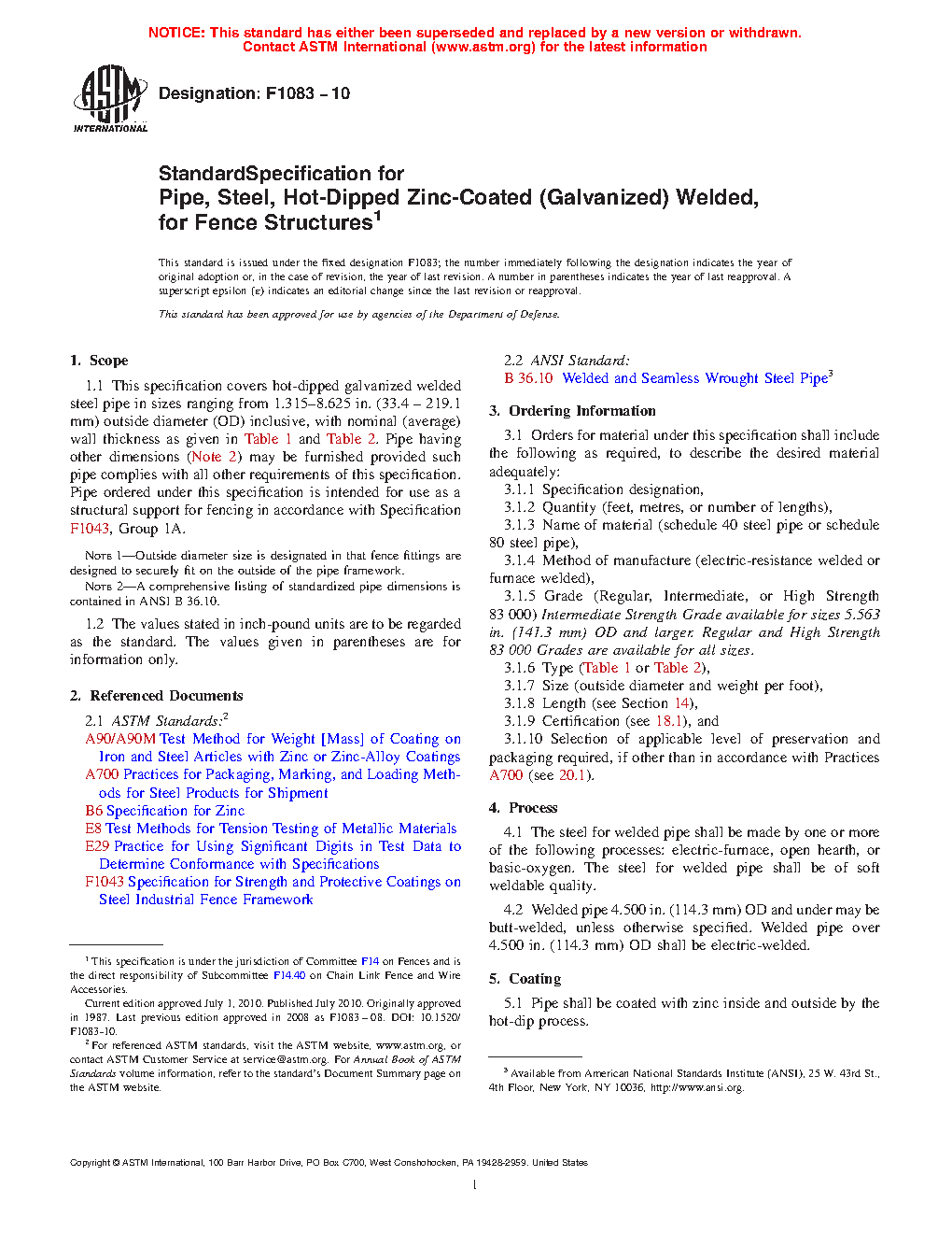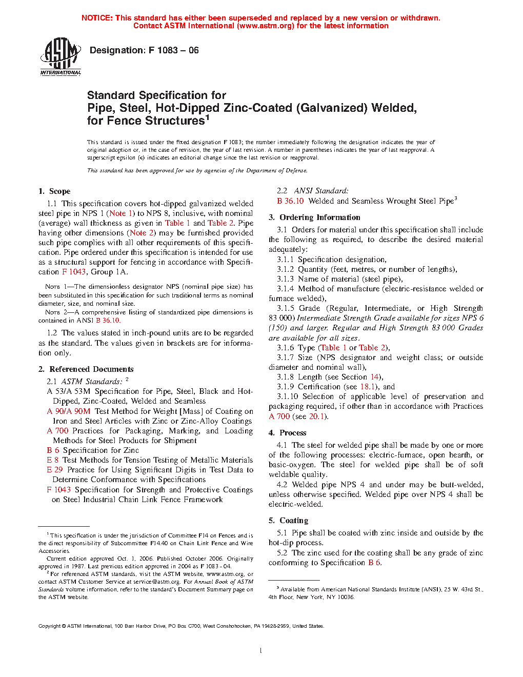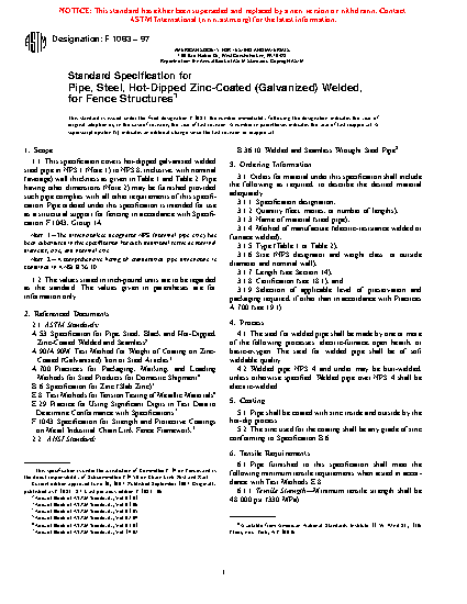 This specification covers hot-dipped zinc-coated (galvanized) welded steel pipe in NPS 1, NPS 1 �, NPS 1 �, NPS 2, NPS 2 �, NPS 3, NPS3 �, NPS 4, NPS 5, NPS 6, NPS 7, and NPS 8, with the specified nominal wall thickness, intended for fence structures such as structural support. Pipe having other dimensions may be furnished provided such pipe complies with all other requirements of this specification. The steel for welded pipe shall be be of soft weldable quality and shall be made by one or more of the following processes: electric-furnace, open hearth, or basic oxygen. Welded pipe NPS 4 and under may be butt-welded. Welded pipe over NPS 4 shall be electric welded. Pipe shall be coated with zinc inside and outside by hot-dip process. The steel pipe shall meet the tensile requirements for tensile strength and yield strength specified for regular, intermediate strength, and high strength grades. The weight of zinc coating shall be determined by strip test. The dimensional (diameter and thickness) and weight requirements for the steel pipe are specified and the test requirements for welded pipes are detailed. Lengths of toprail may be of random lengths, unless otherwise specified.