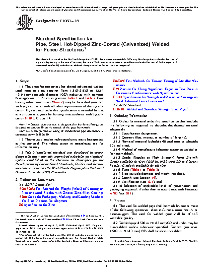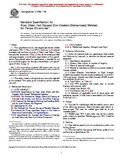 1.1 This specification covers hot-dipped galvanized welded steel pipe in sizes ranging from 1.315–8.625 in. (33.4 – 219.1 mm) outside diameter (OD) inclusive, with nominal (average) wall thickness as given in Table 1 and Table 2. Pipe having other dimensions (Note 2) may be furnished provided such pipe complies with all other requirements of this specification. Pipe ordered under this specification is intended for use as a structural support for fencing in accordance with Specification F1043, Group 1A.