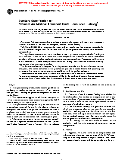 1.1 This specification provides the format and guidelines for producing a catalog of current resources of air medical transport units, showing the patient care capability of each, in standard form.