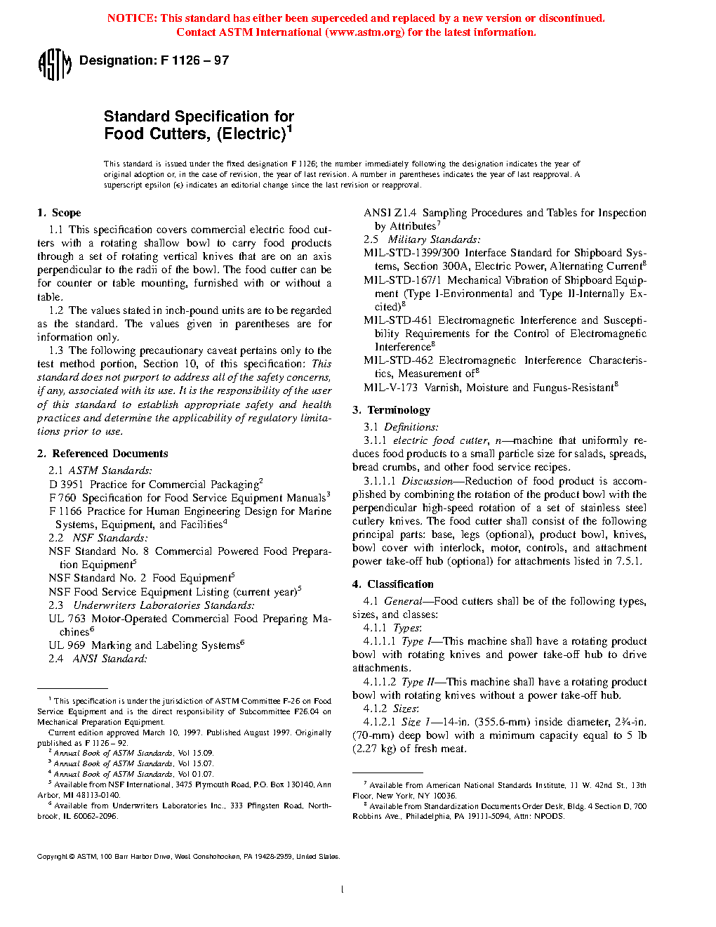 This specification covers commercial electric food cutters with a rotating shallow bowl to carry food products through a set of rotating vertical knives that are on an axis perpendicular to the radii of the bowl. The food cutter can be for counter or table mounting, furnished with or without a table. Food cutters shall be of the following types, sizes, and classes: Types I and II; Sizes 1 and 2; and Classes A and B. Test methods shall be performed to conform with the specified requirements.