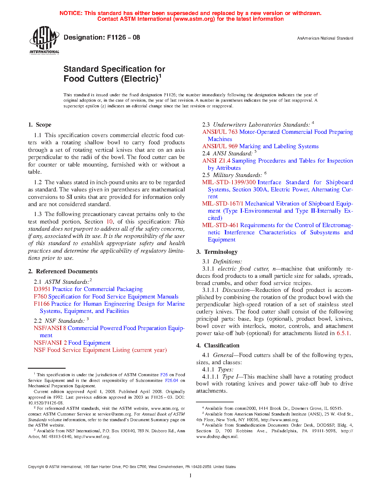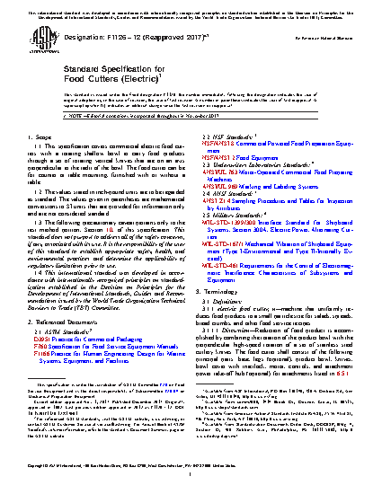 1.1 This specification covers commercial electric food cutters with a rotating shallow bowl to carry food products through a set of rotating vertical knives that are on an axis perpendicular to the radii of the bowl. The food cutter can be for counter or table mounting, furnished with or without a table.