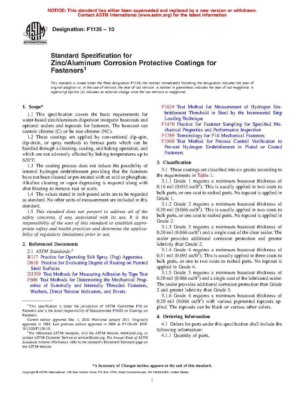 This specification covers the basic requirements and associated test methods for water-based corrosion protective zinc/aluminum dispersion inorganic basecoats, and optional sealers and topcoats for fasteners. The basecoat can contain chrome (C) or be non-chrome (NC). These coatings are applied to ferrous parts by conventional dip-spin, dip-drain, or spray methods, which can be handled through a cleaning, coating, and baking operation, and which are not adversely affected by baking temperatures up to 626 °F. The coatings are classified into six grades (Grades 1 to 6) according to the required minimum basecoat thickness, and when tested, shall conform accordingly to appearance, adhesion, corrosion resistance, blister, thread fit, and hydrogen embrittlement requirements. The coating process does not induce the possibility of internal hydrogen embrittlement provided that the fasteners have not been cleaned or pre-treated with an acid or phosphate. Alkaline cleaning or vapor degreasing is required along with shot blasting to remove rust or scale. No metric equivalents are presented in this specification.