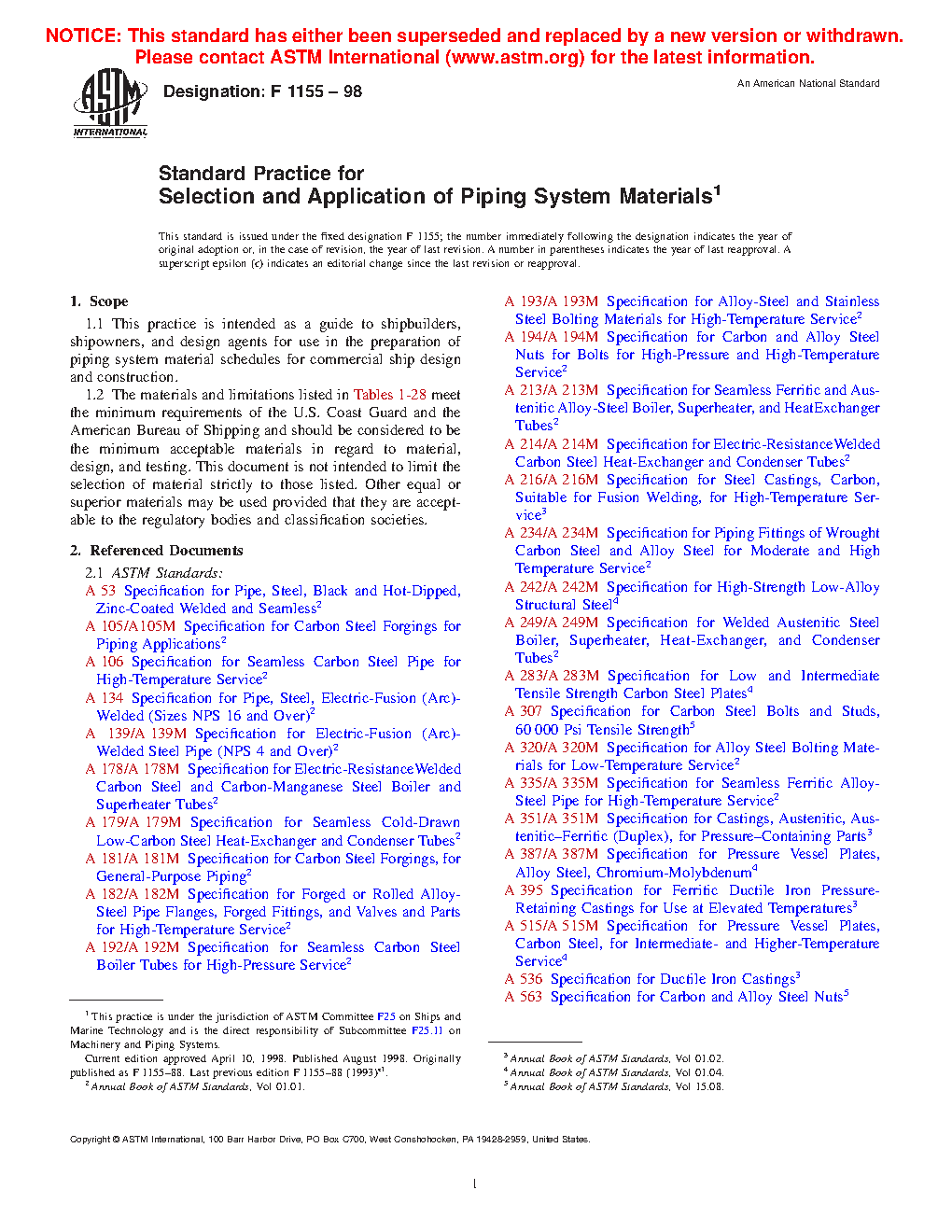 1.1 This practice is intended as a guide to shipbuilders, shipowners, and design agents for use in the preparation of piping system material schedules for commercial ship design and construction.
